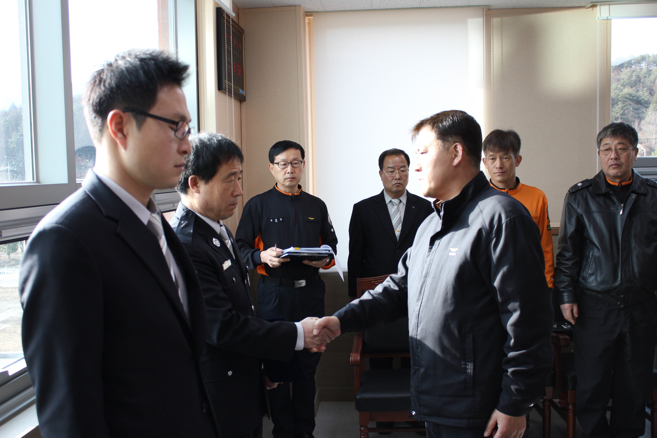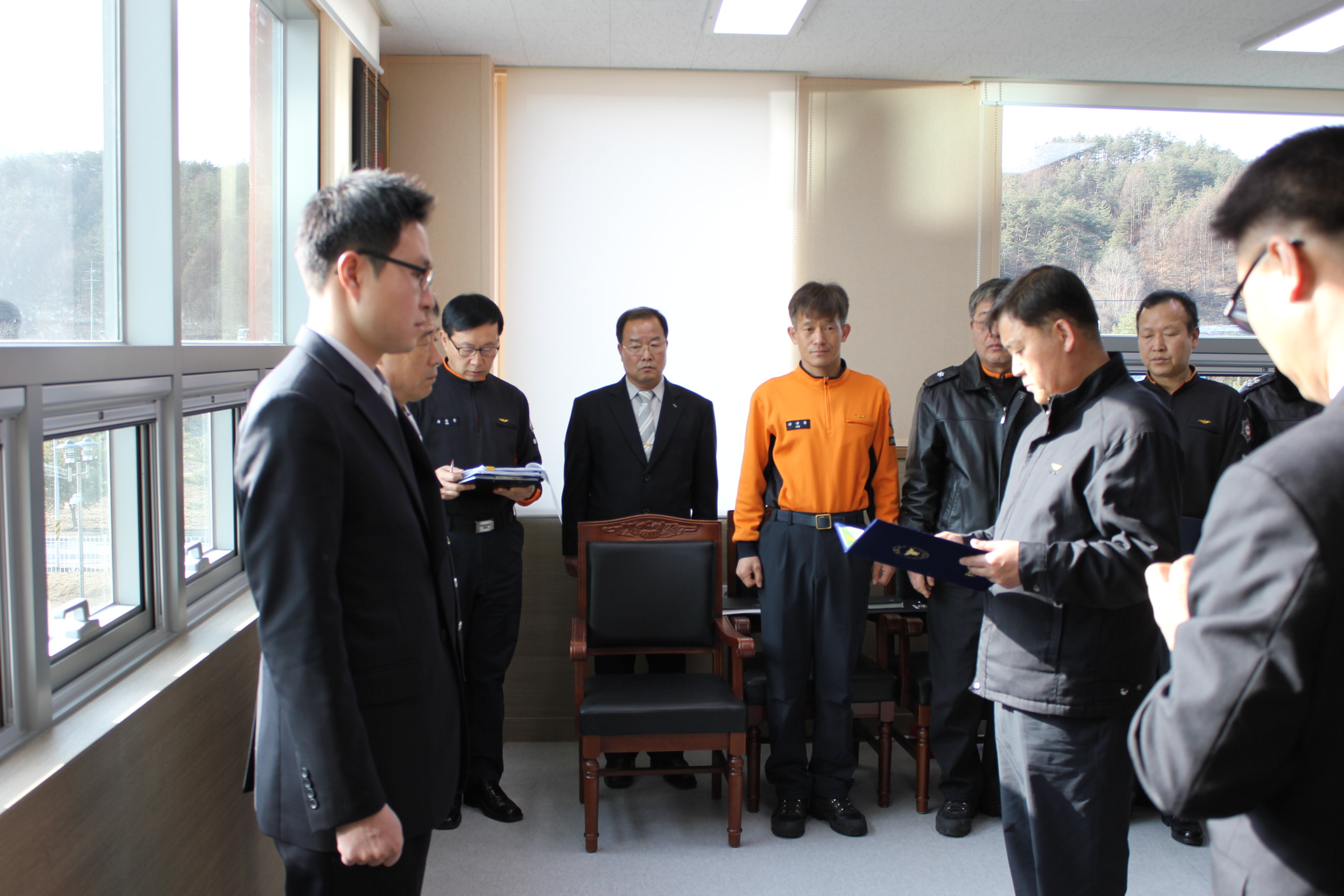 평창소방서(서장 김용락)는 19일 오전 서장실에서 평창소방서 청사 준공 및 개서에 기여한 공을 인정하여 소방행정과 예산장비계 박태웅 반장에게 표창장(도지사)을 수여했다. 그리고 근속승진자에 대한 임용장 수여식도 함께 가졌다.