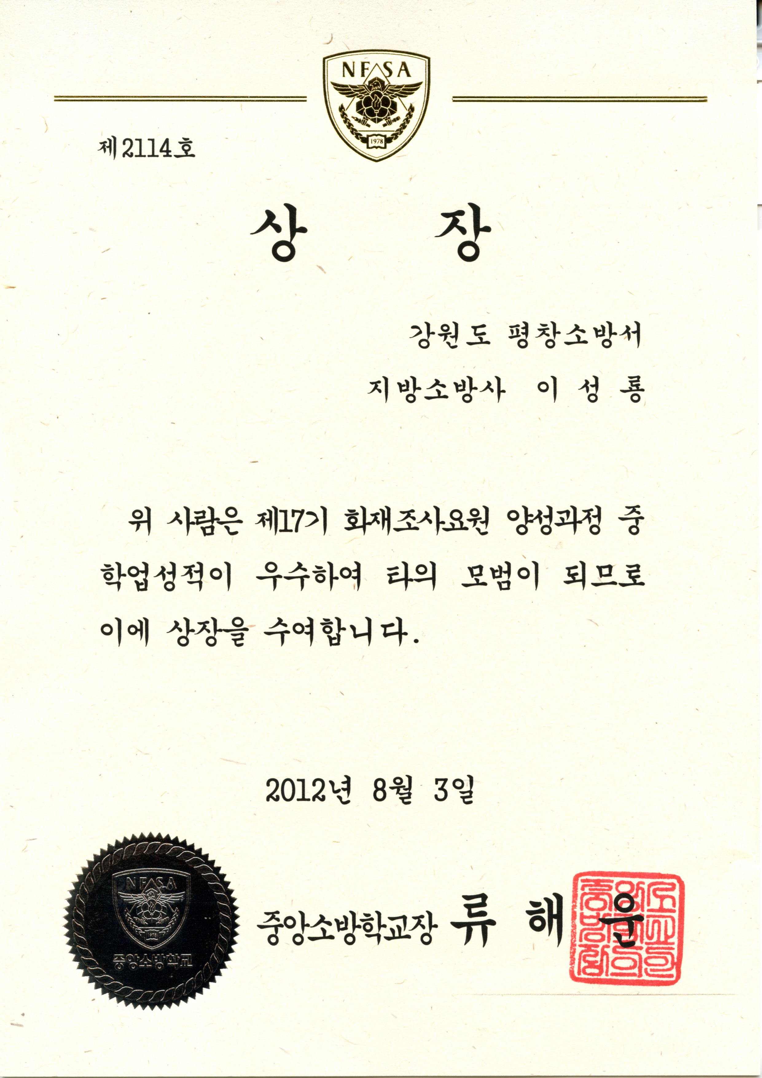 언빌리버블한 소식~ 소방사 이성용 화재조사 요원 양성과정 우수상 수상