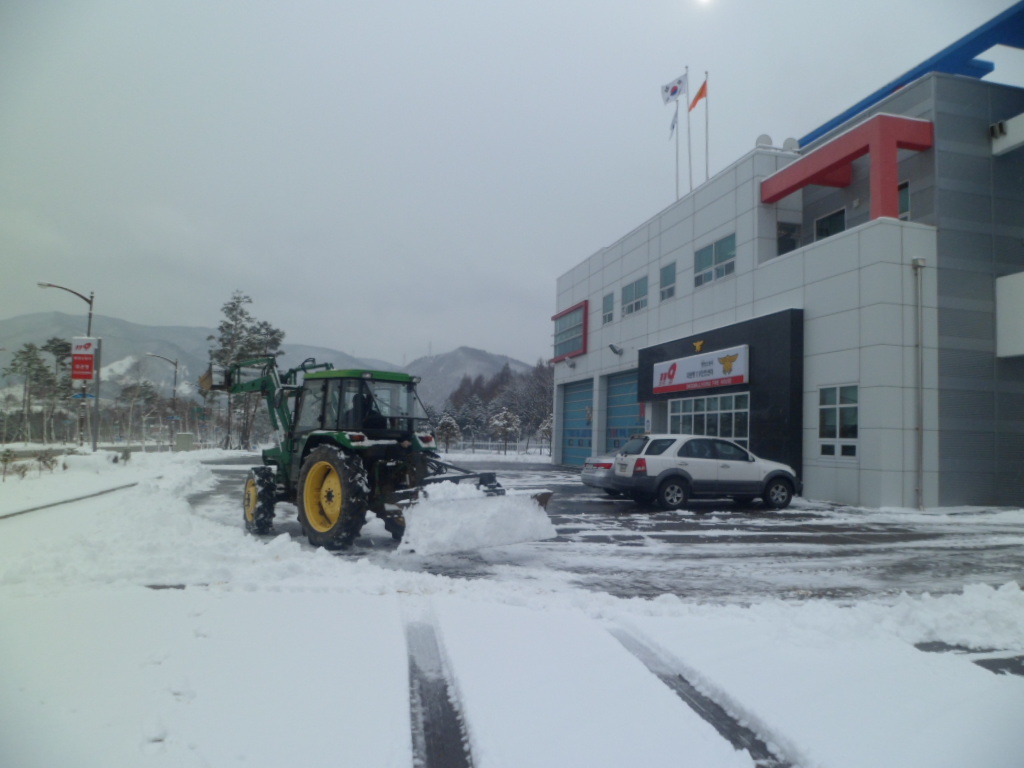 제설작업간 대관령 의용소방대 함길수대원의 트랙터협조로 인하여 수월한 작업이 되어 직원들은 감사해하고있다