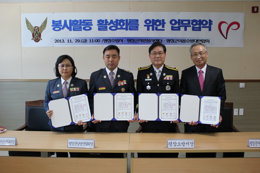 ◇평창소방서(서장 김남숙)는 29일 본서 소회의실에서 평창군자원봉사센터(센터장 김선한)·평창군의용소방대연합회(회장 민경식)간 자원봉사 활성화를 위한 업무협약을 체결 하였다.