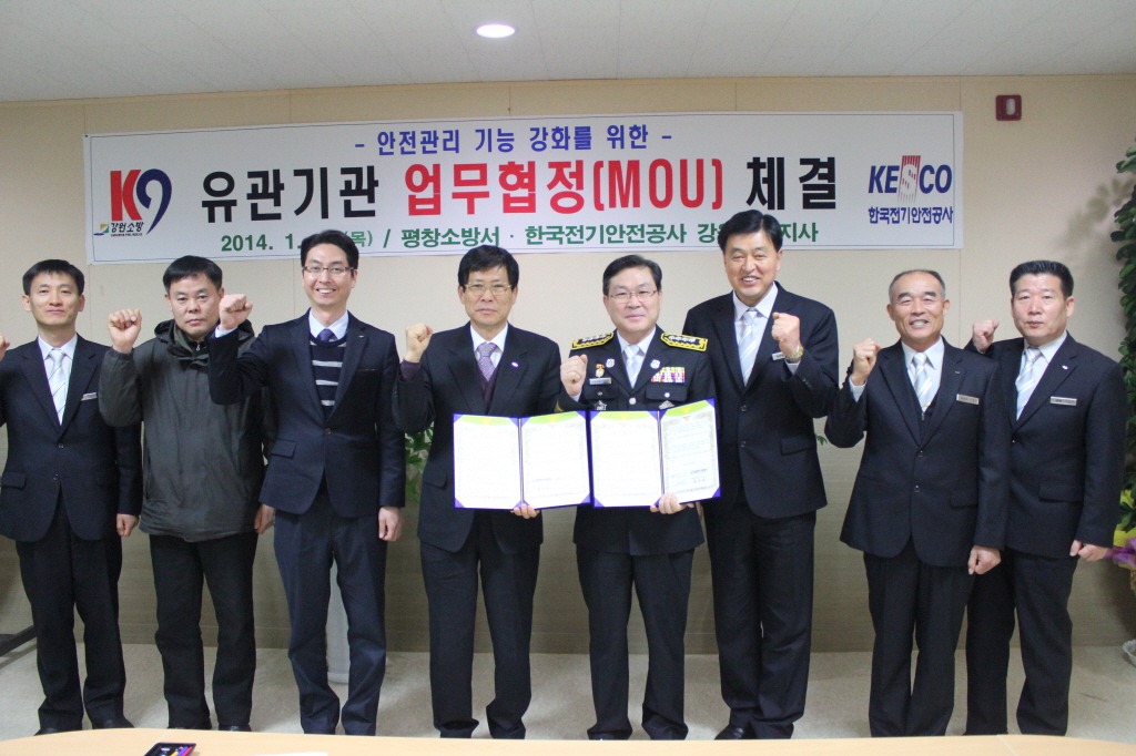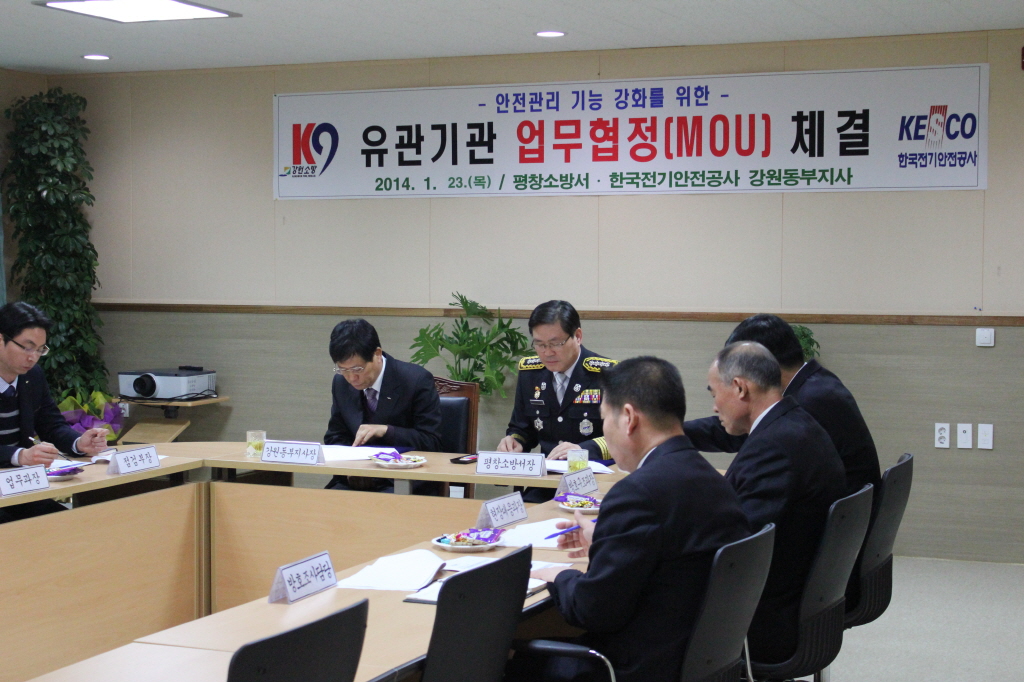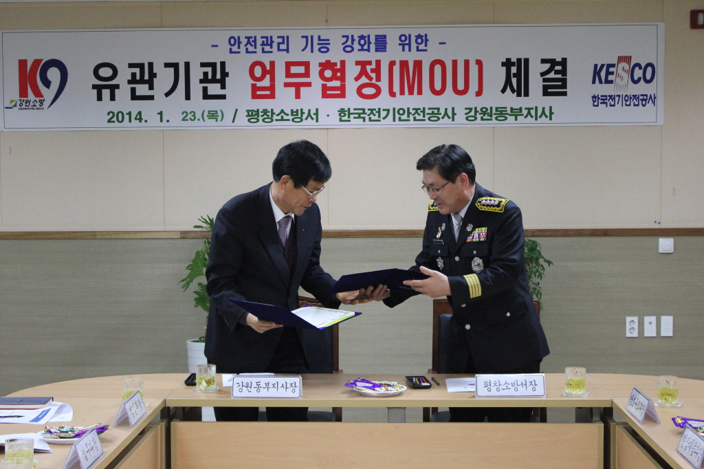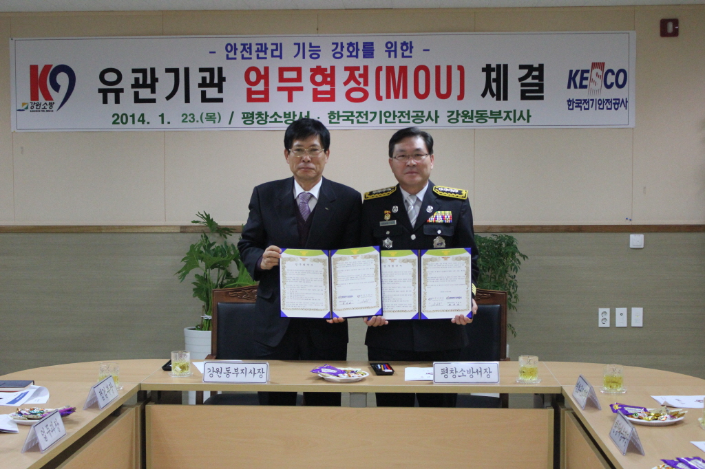 ◇ 평창소방서(서장 김남숙)는 2014. 1. 23(목) 11시 평창소방서 소회의실에서 한국전기안전공사 강원동부지사와 화재로 인한 인명피해를 줄이고 전기안전문화 정착을 위하여 업무협약(MOU)을 체결하였다.