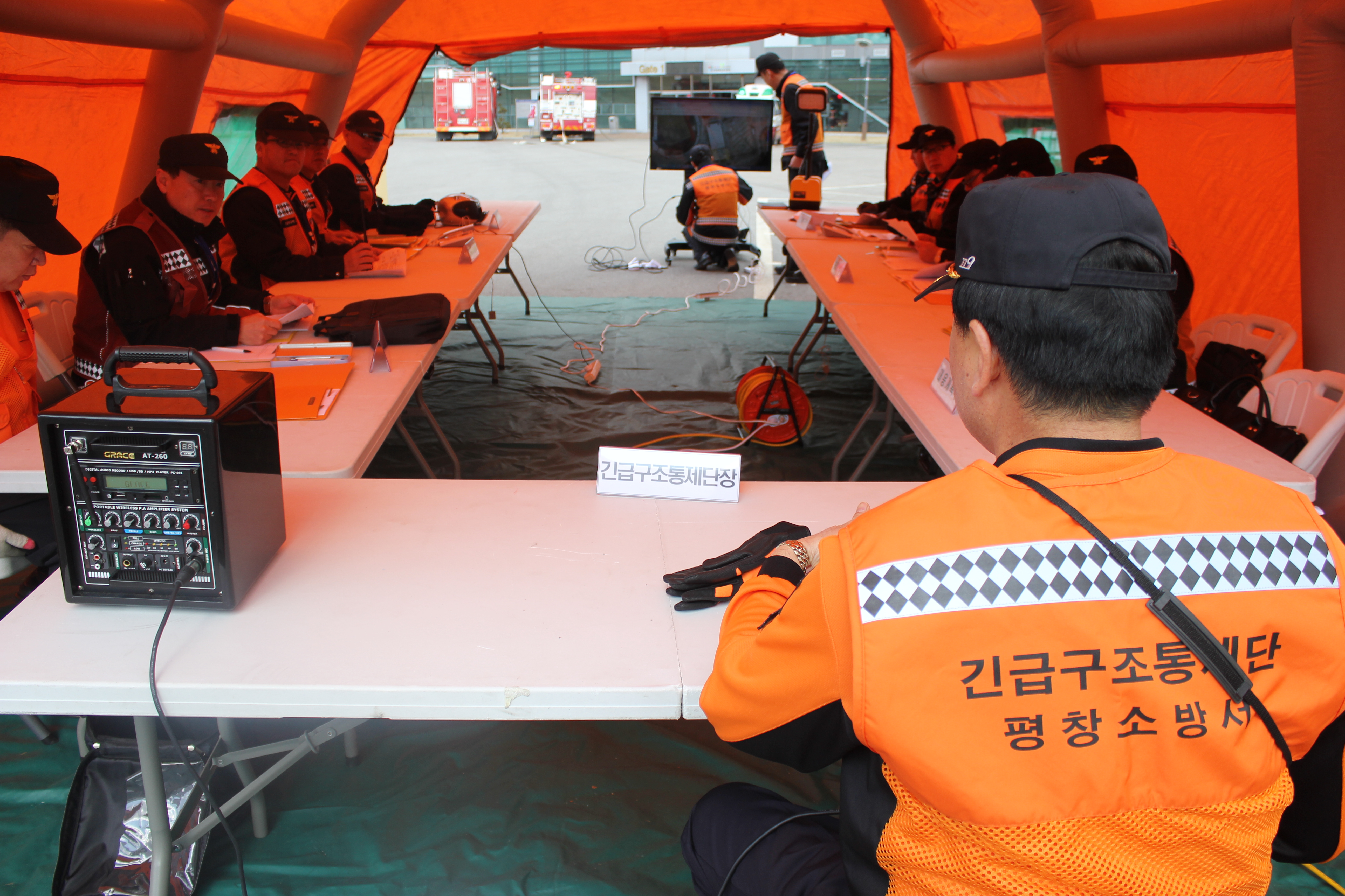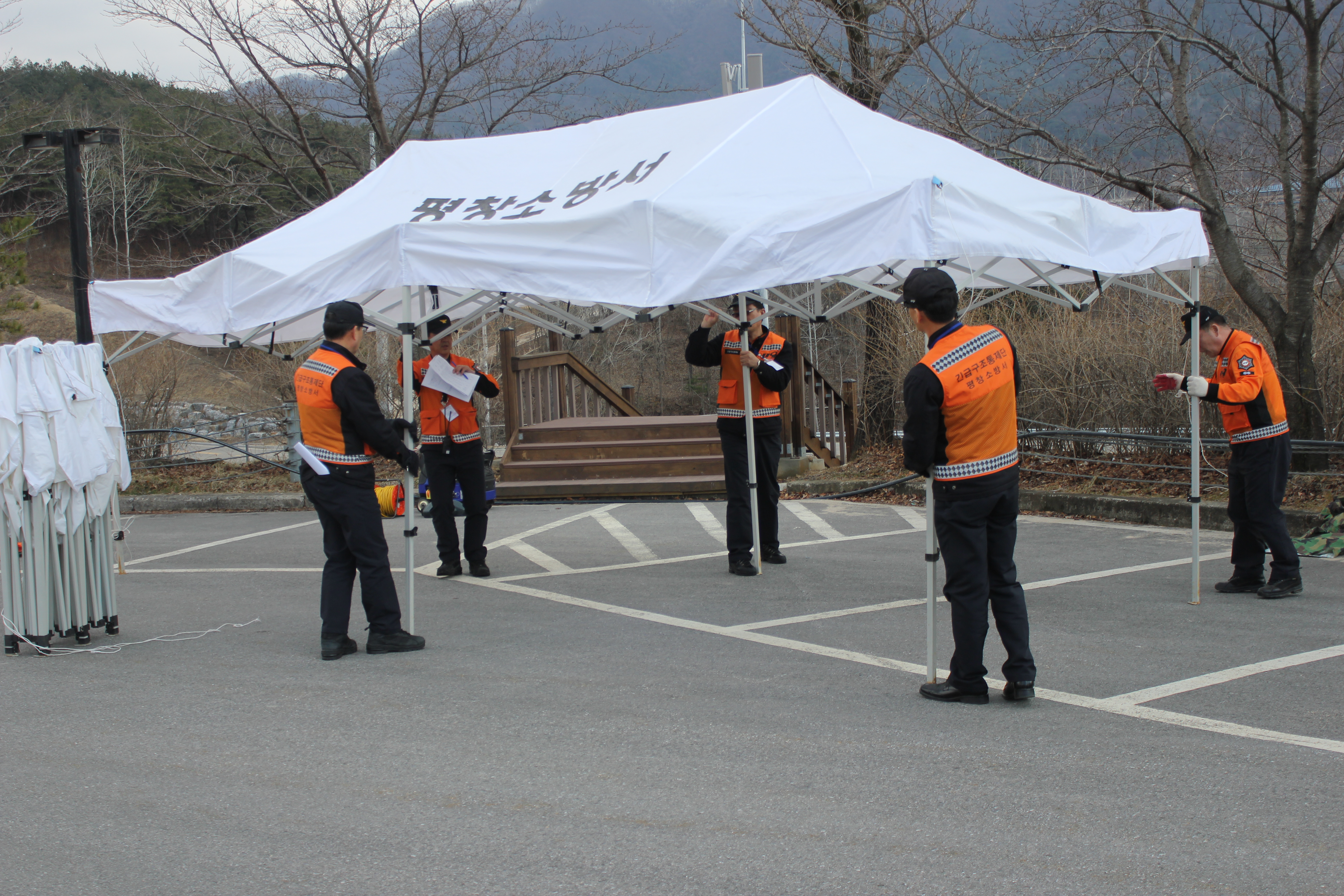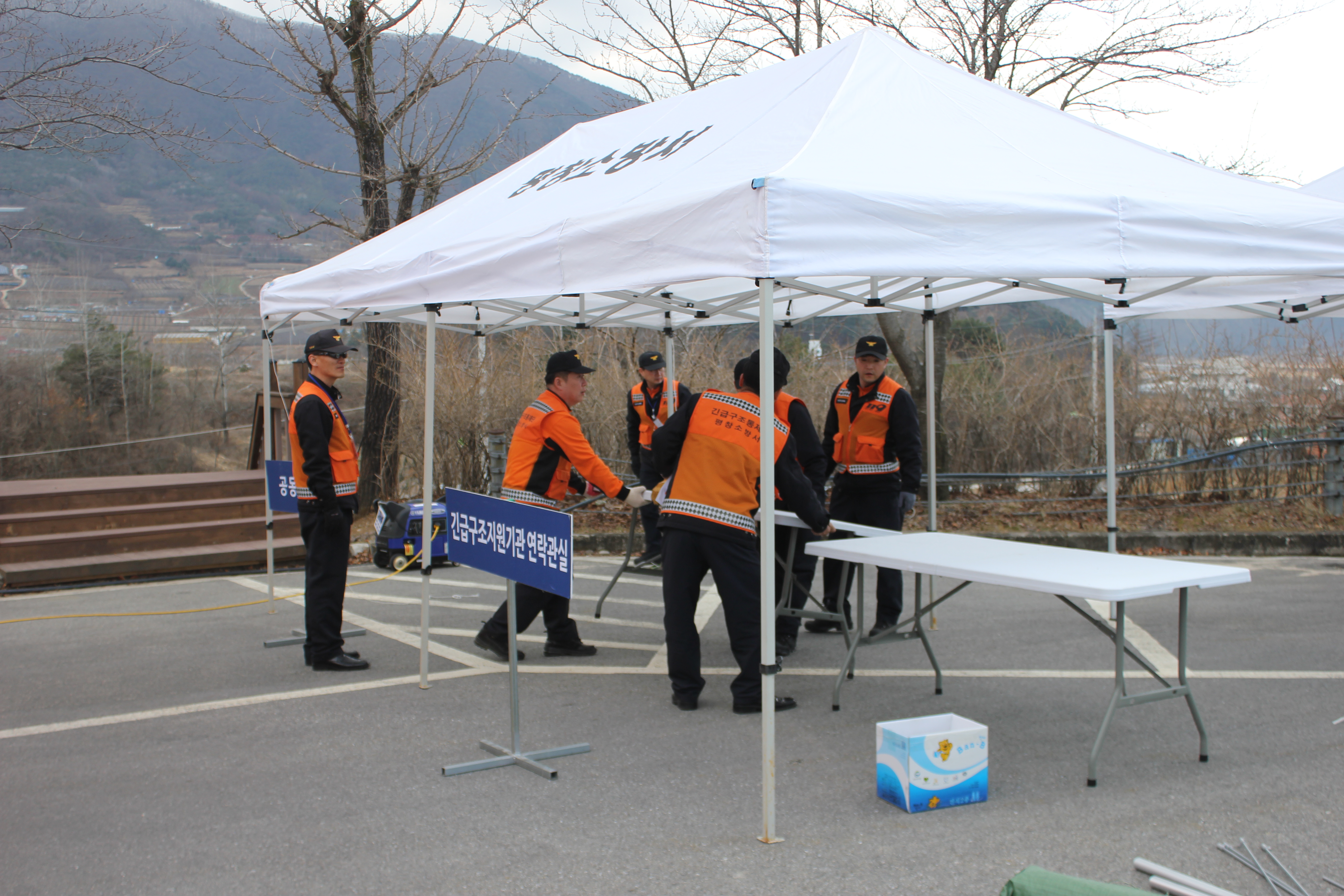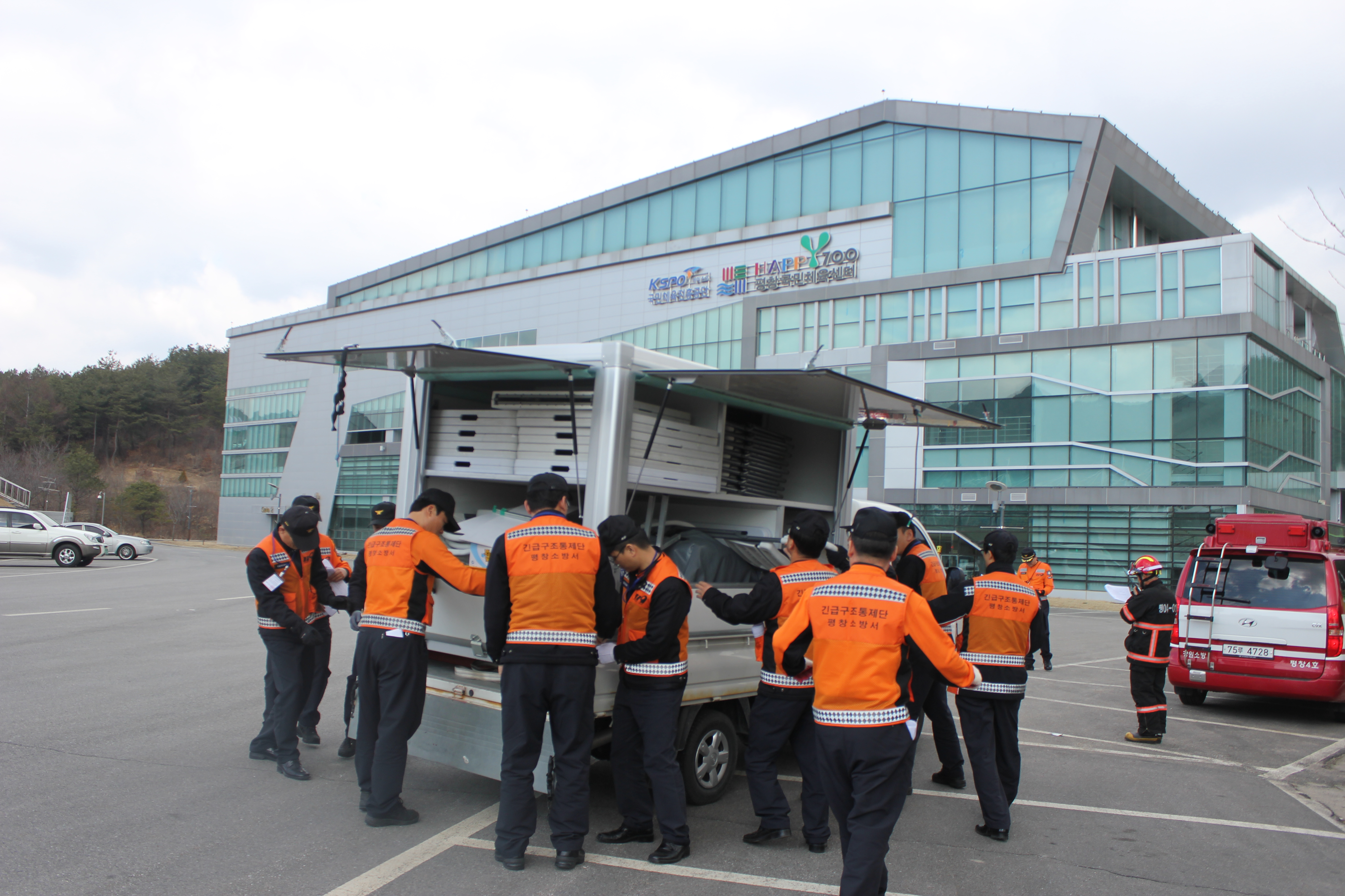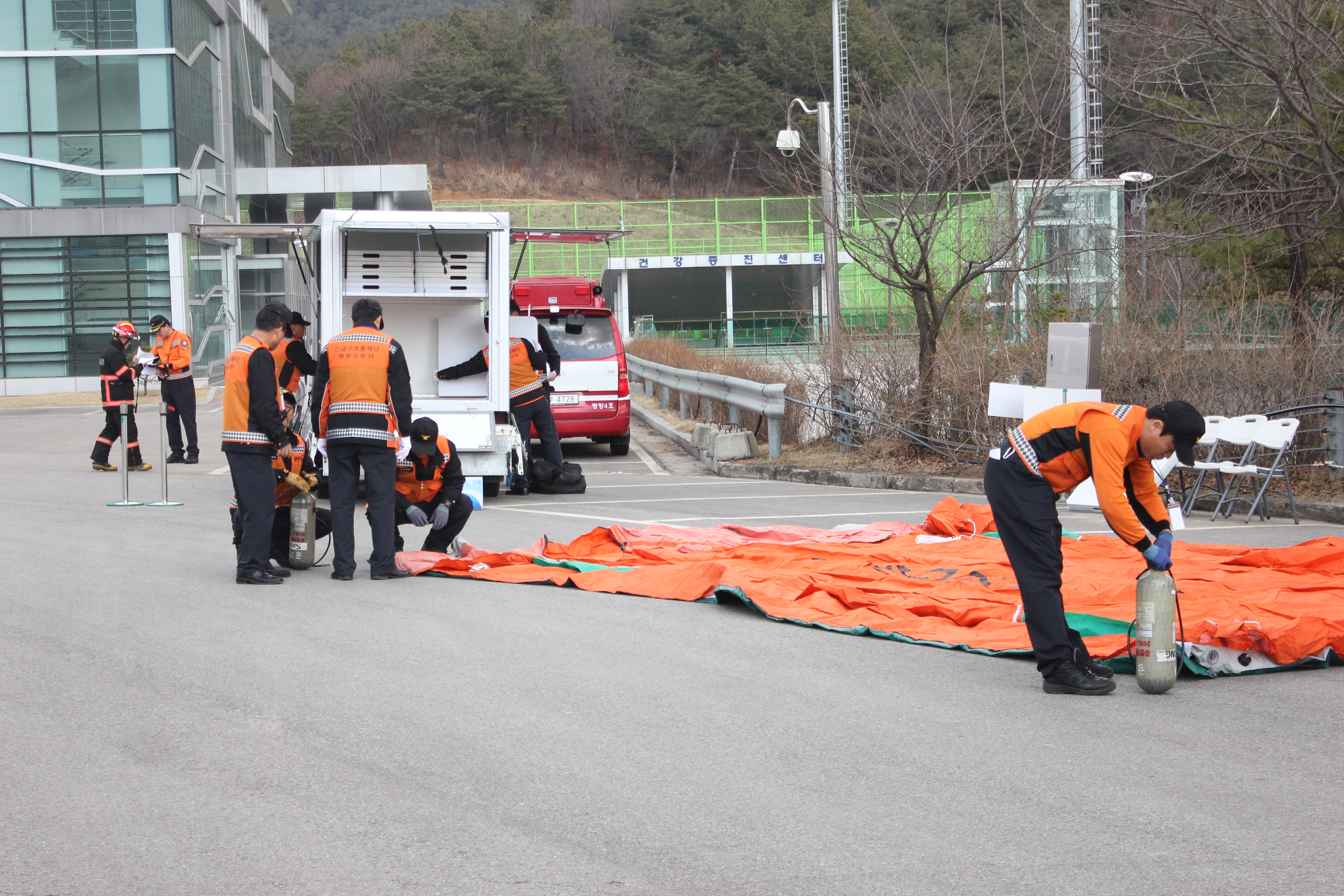 같은날 오후 14시 평창군 평창읍 종부로 69-27 “평창국민체육센터”에서 가스폭발로 현관 일부 붕괴되고, 1층에서 화재가 발생하여 다수의 사상자가 발생한 상황으로 이벤트에 따른 불시통제단 가동훈련을 실시하였다.