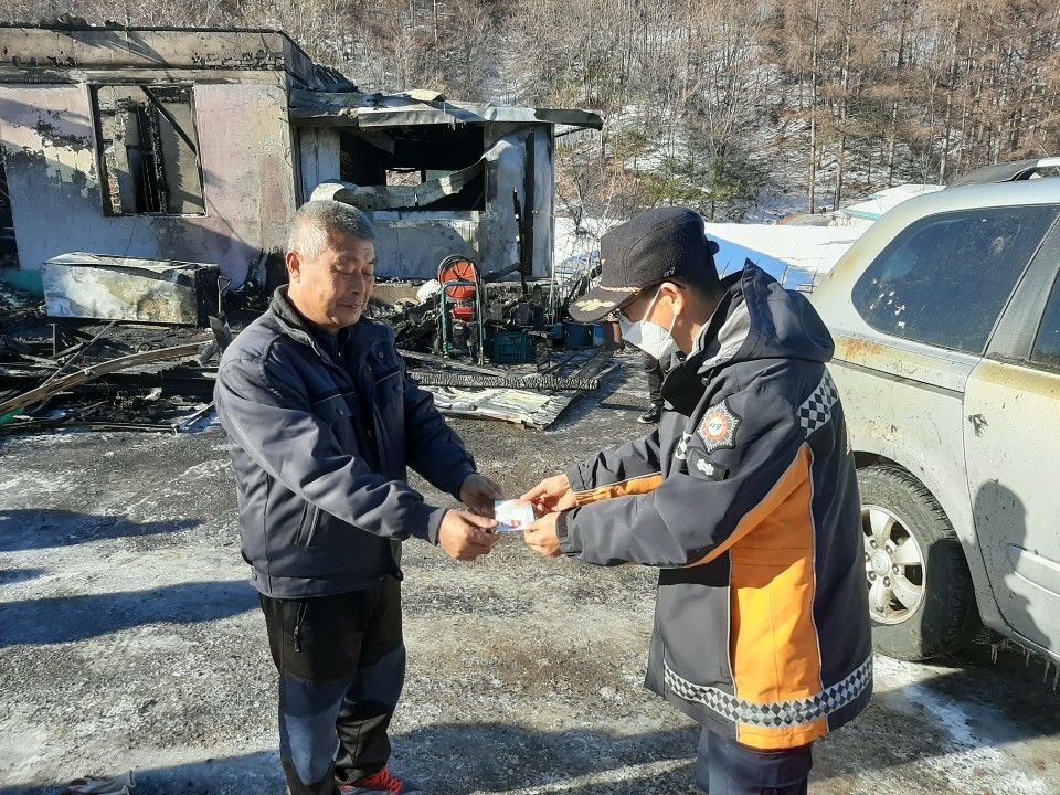 평창소방서는 지난 17일 새벽 1시 용평면에서 원인 미상의 화재로 집을 잃은 주민에게 강원119행복기금 나눔 지원의 일환으로 강원상품권(30만원)을 전달했다고 밝혔다.