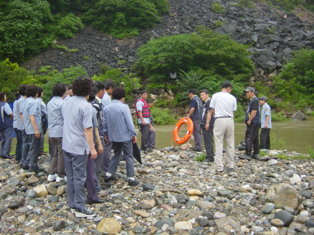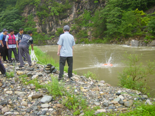 신기의용소방대 남. 여 여름 물놀이 안전사고 예방및 구조 실무 교육 활동 ( 장소: 오십천)