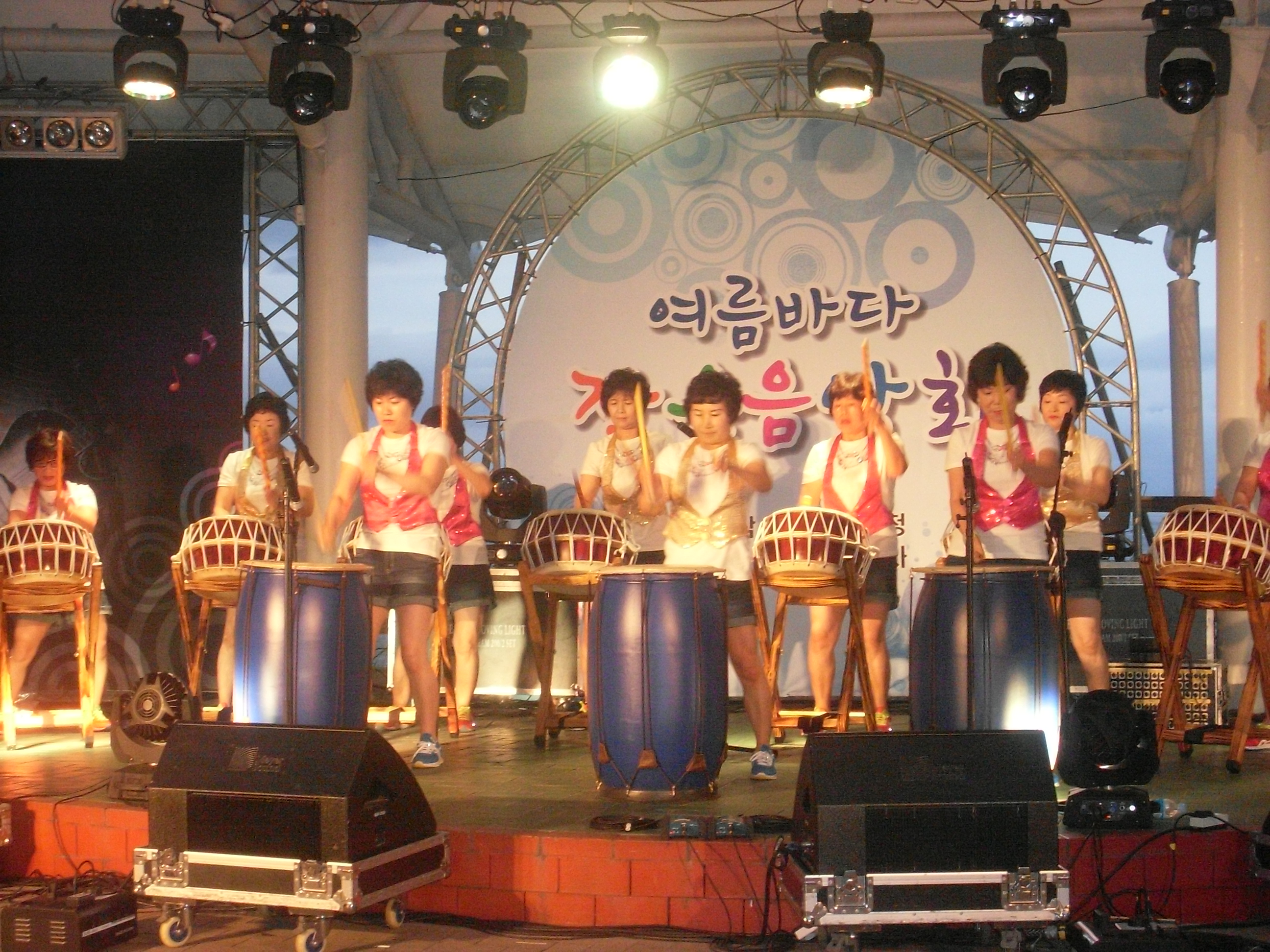 조각공원에서 저녁 시간때 행사를 행사 시작하다보니 피서객들이 많은 가운데 신나게 북을 두들기는데 호응이 넘좋아서 즐거운 시간이였습니다. 공연하지 않는 대원들도 차량지원 응원 참석