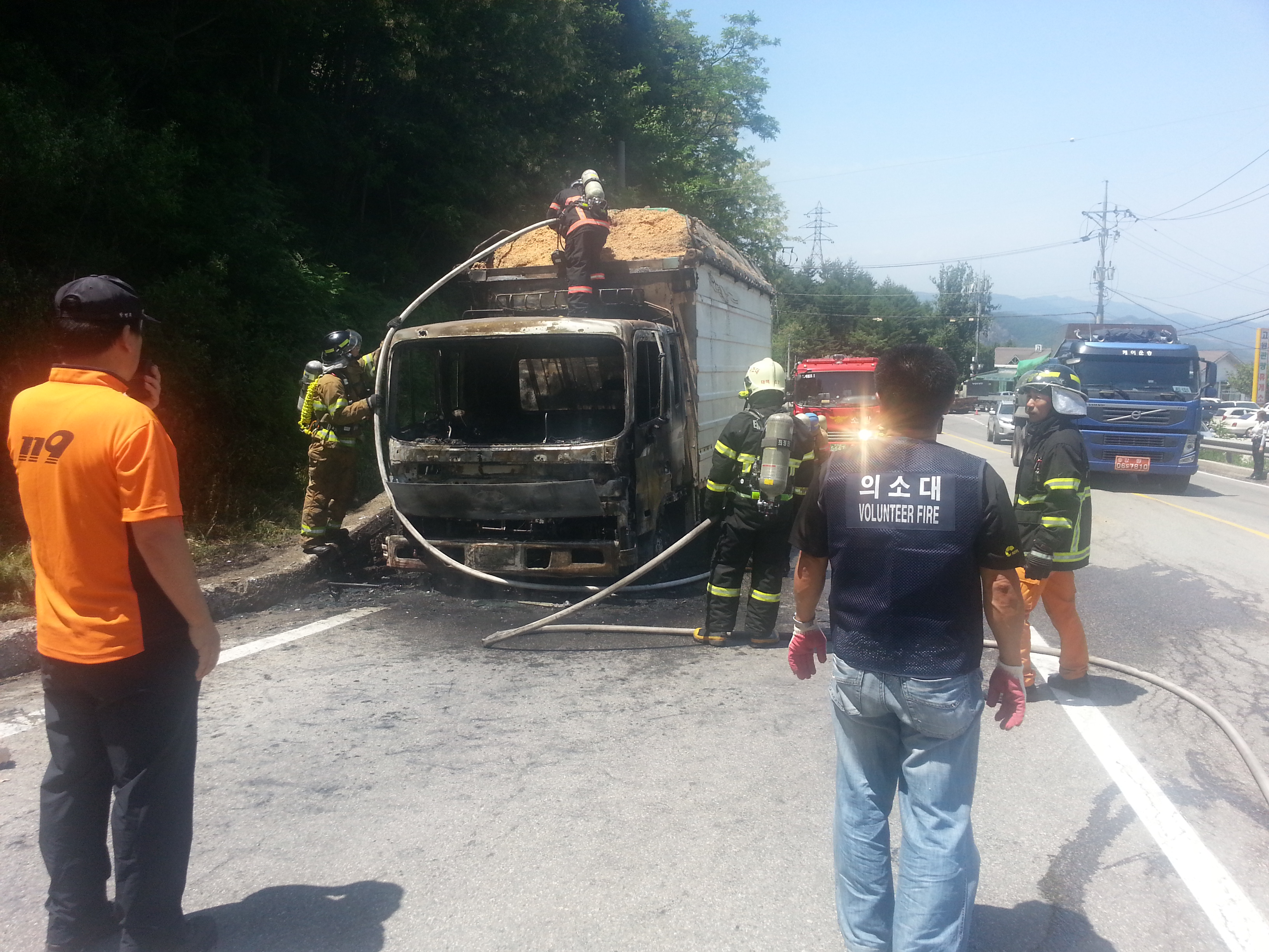 도계의용소방대(대장 김광우)는 고원휴게소 부근차량화재진압