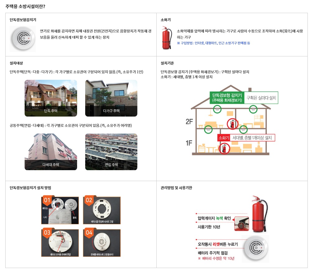 주택용 소방시설은 ‘화재예방, 소방시설 설치·유지 및 안전관리에 관한 법률’에 따라 단독·연립·다가구주택 등에서 의무적으로 설치해야 한다. 소화기는 각 세대·층별 1개 이상, 단독경보형 감지기는 방과 거실 등 구획된 실마다 1개씩 필요하다.