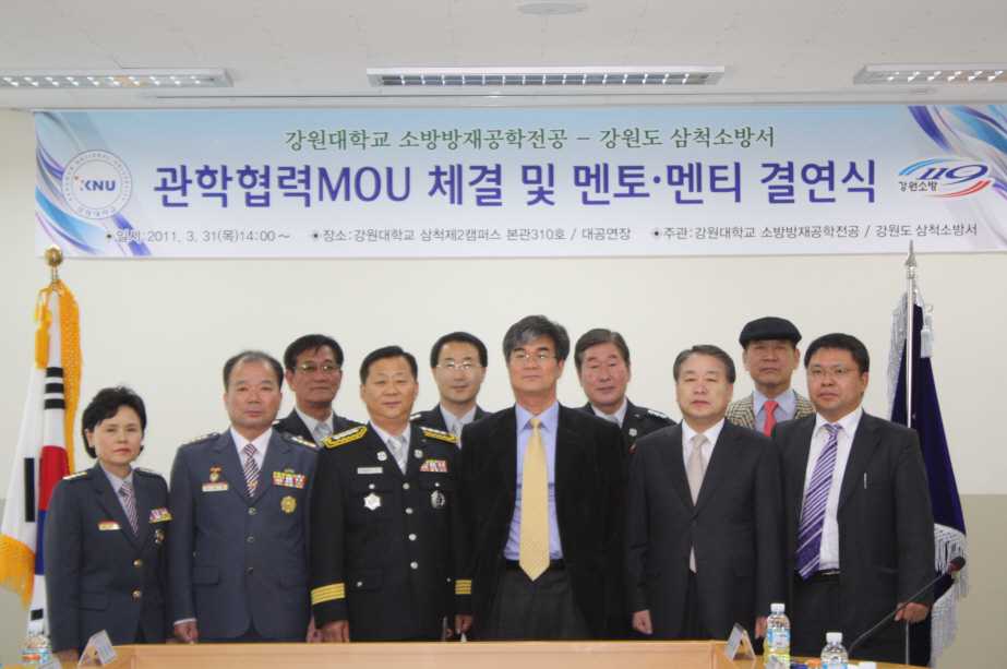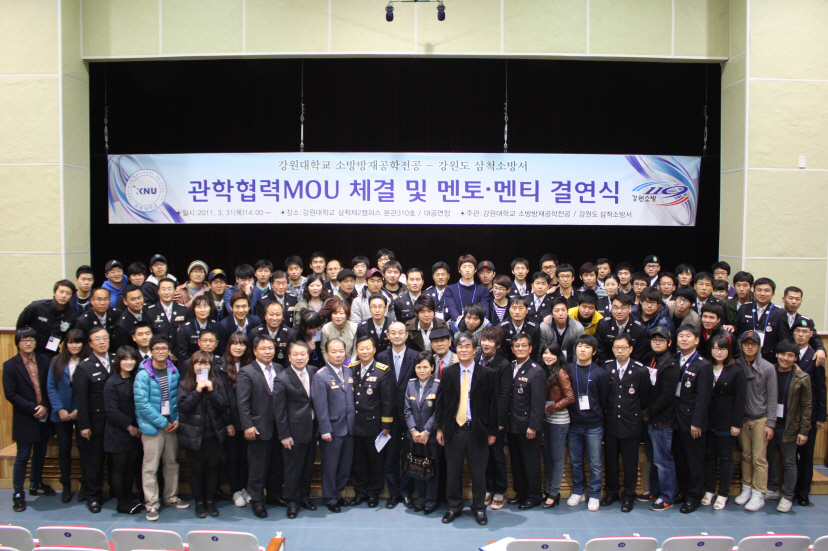 김상철 삼척소방서장은 31일 오후 2시부터 강원대학교 도계캠퍼스에서 관학 MOU 협약식 체결 및 소방방재공학전공 3학년 학생 55명과 멘토링 결연식을 실시했다.
