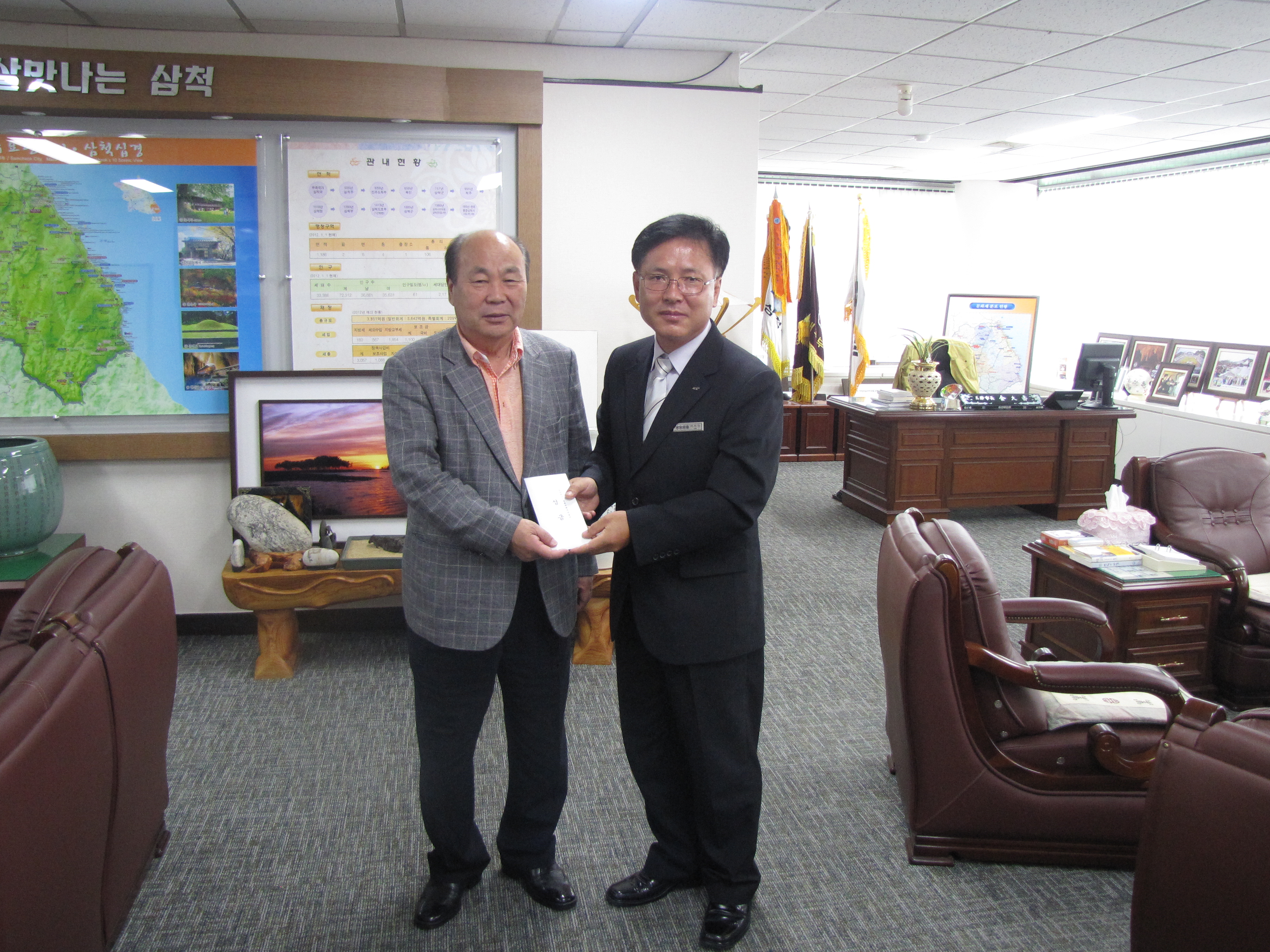 2012년 8월 28일 오전10시 30분 삼척시청 시장실에서 지난 17일(금) 삼척시 남양동 LNG노래타운 건물 LPG가스 폭발 사고 피해주민들을 돕기 위하여 성금 200만원을 김대수 삼척시장에게 전달하였다.