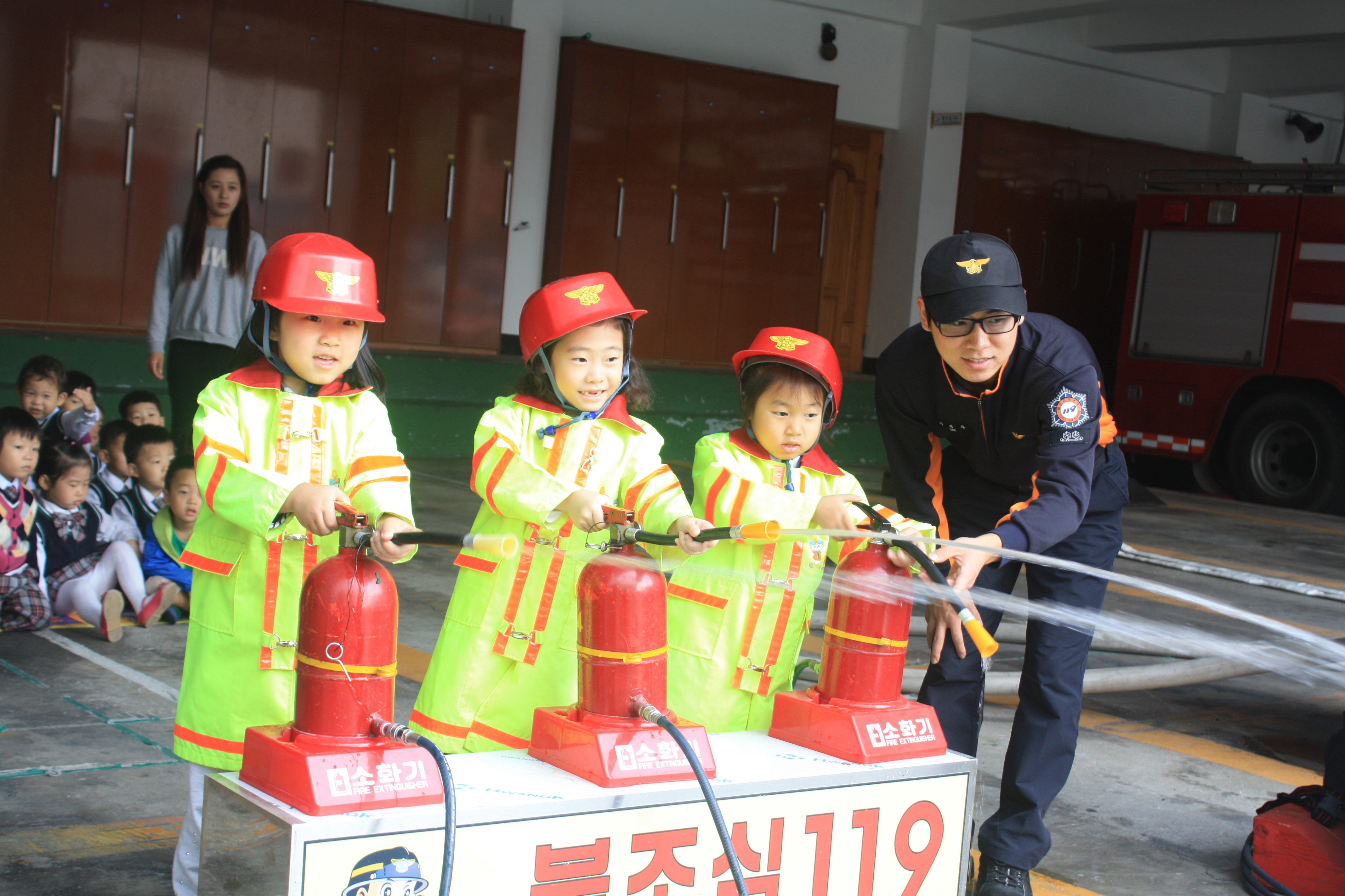 □ 삼척소방서【서장 이지만(李志晩)】는 2012년 10월 10일(수)10시부터 11시까지 풀초롱 어린이집 원아 70여명을 대상으로 어린이들의 눈높이에 맞춰 소방서에서 하는 일, 화재시, 대피요령, 방화복 입어보기, 소방차량 탑승 및 방수체험 등 다양한 체험교육을 실시했다. 아울러 지도교사들에게도 소화기사용법과 어린이집은 물론 가정에서도 흔히 일어날 수 있는 긴급 상황시 대처요령에 대한 교육도 이뤄졌다. 소방서를 찾은 어린이집 관계자는 “친절하게 설명해주는 소방관들 덕에 아이들에게 무척 소중한 시간이 되었을 것”이라며 소방서에 감사의 마음을 전했다.