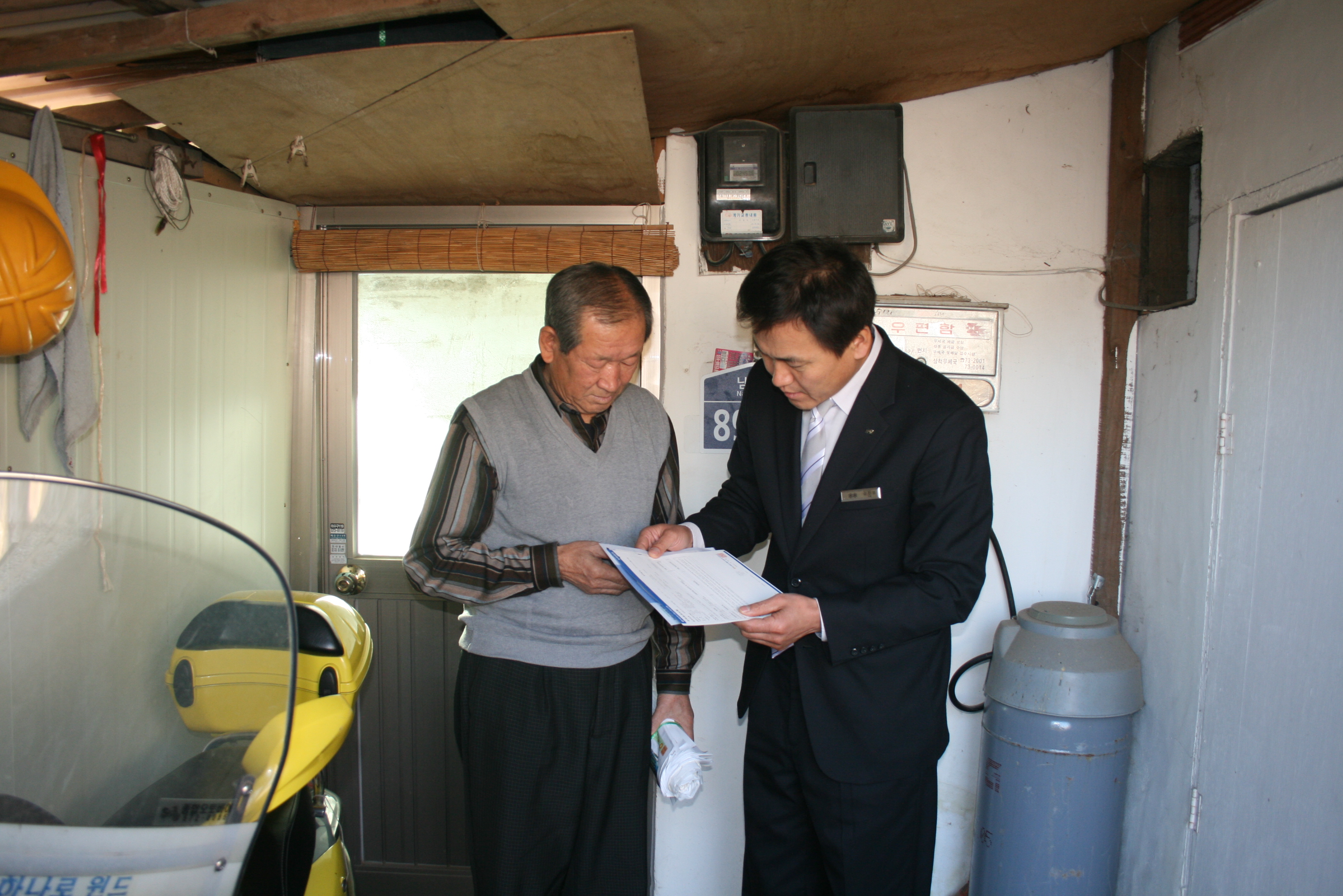 12. 27(목) 관내 독거노인, 장애인, 소년소녀가장 등의 저소득층 (이연우외 41가구)에 대해 대원들이 자발적으로 모은 성금으로 화재보험을 가입해 주었다.