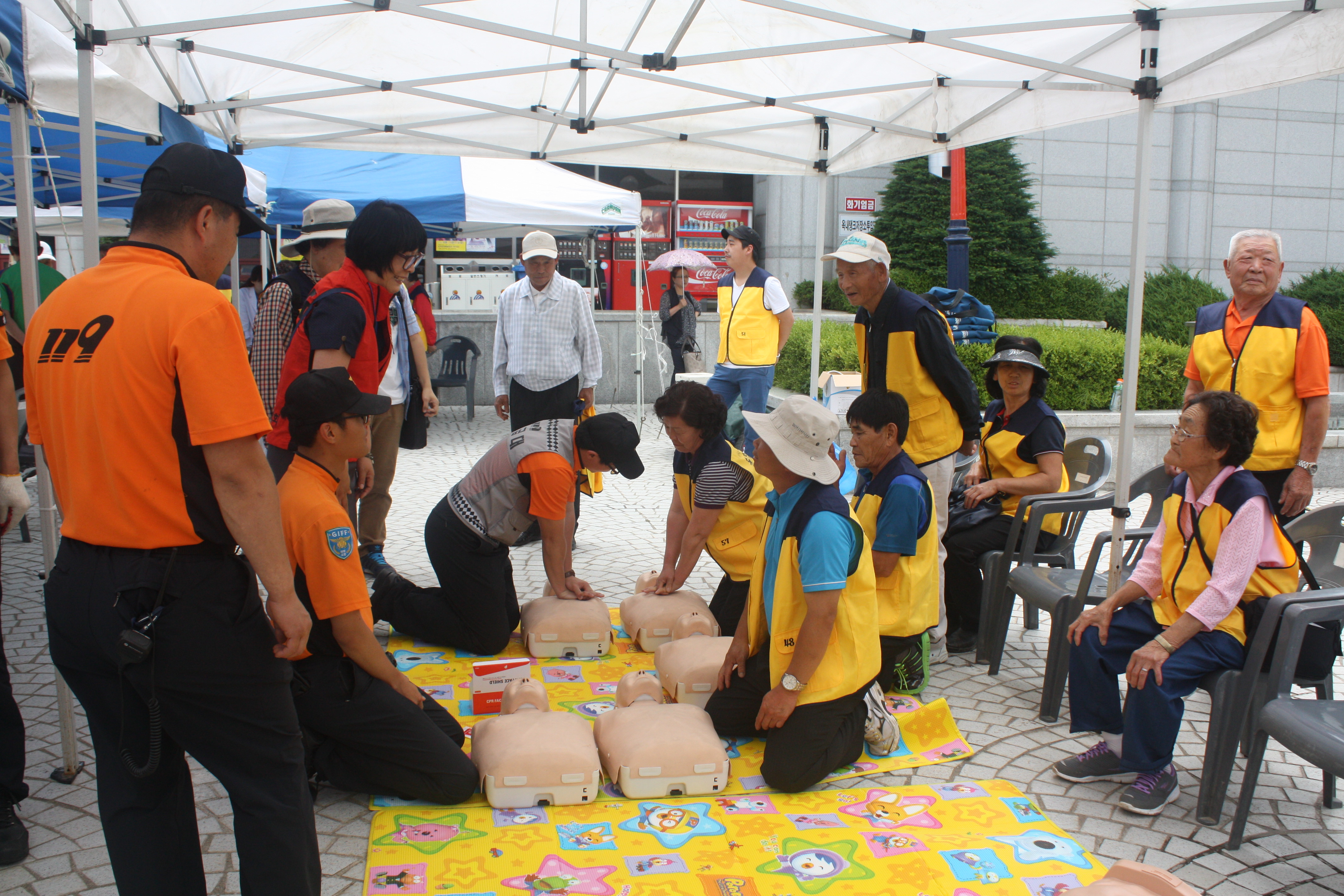 소방안전체험장에서는 ▲ 물소화기 체험 및 소화기 사용법 교육 ▲ 굴절차에서 안전매트로 탈출 ▲ 연기체험바운스 체험 및 화재시 대비법 교육 ▲ 심폐소생술 (CPR)교육 및 체험 ▲ 소방안전작품 및 구조장비 전시 등을 실시하였다.