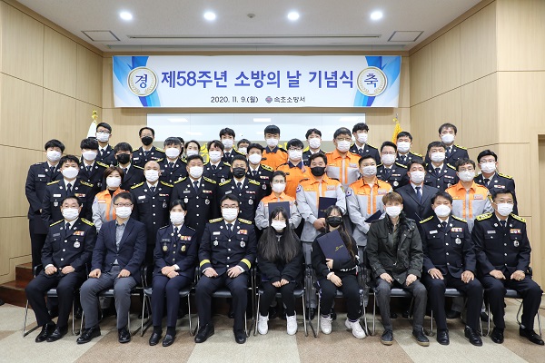 속초소방서(서장 염홍림)는 9일 대회의실 3층에서 소방공무원과 속초남ㆍ여의용소방대원 등이 참석한 가운데 ‘제58주년 소방의날 기념식’을 가졌다고 밝혔다.