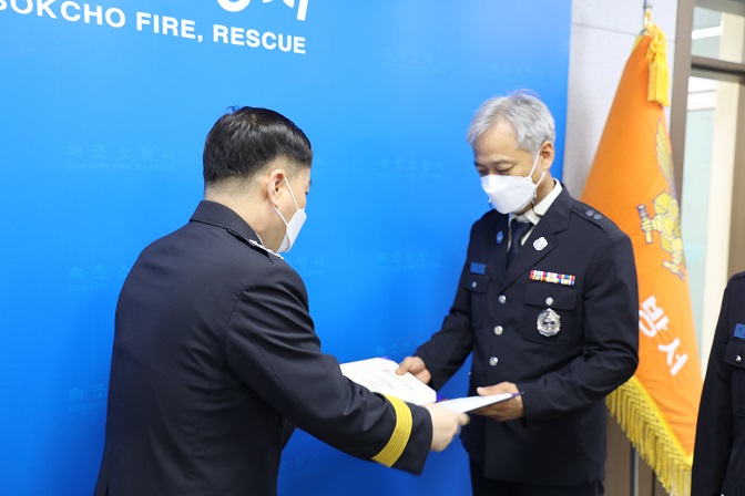 베테랑 소방관에게는 증서와 배지, 자수와 2021년 성과 인센티브를 준다
