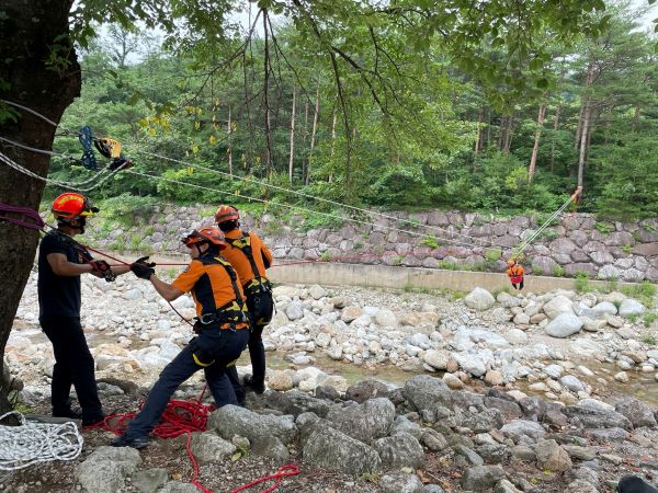 속초소방서(서장 장상훈)는 여름 휴가철을 맞아 태풍ㆍ집중호우 등 자연재난ㆍ사고에 대비해 속초시 설악동 피골계곡 일대에서 급류구조훈련과 수평ㆍ수직구조훈련을 실시했다고 밝혔다.