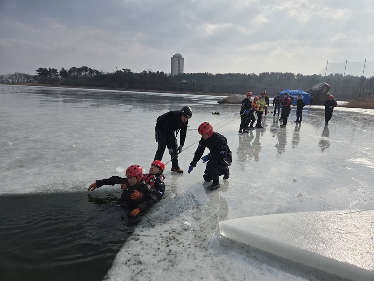 이번 훈련은 해빙기에 발생할 수 있는 얼음 깨짐· 익수 사고 상황에서 신속하고 효율적으로 대응하기 위해 마련됐다. 서내 구조대원이 참여했다.