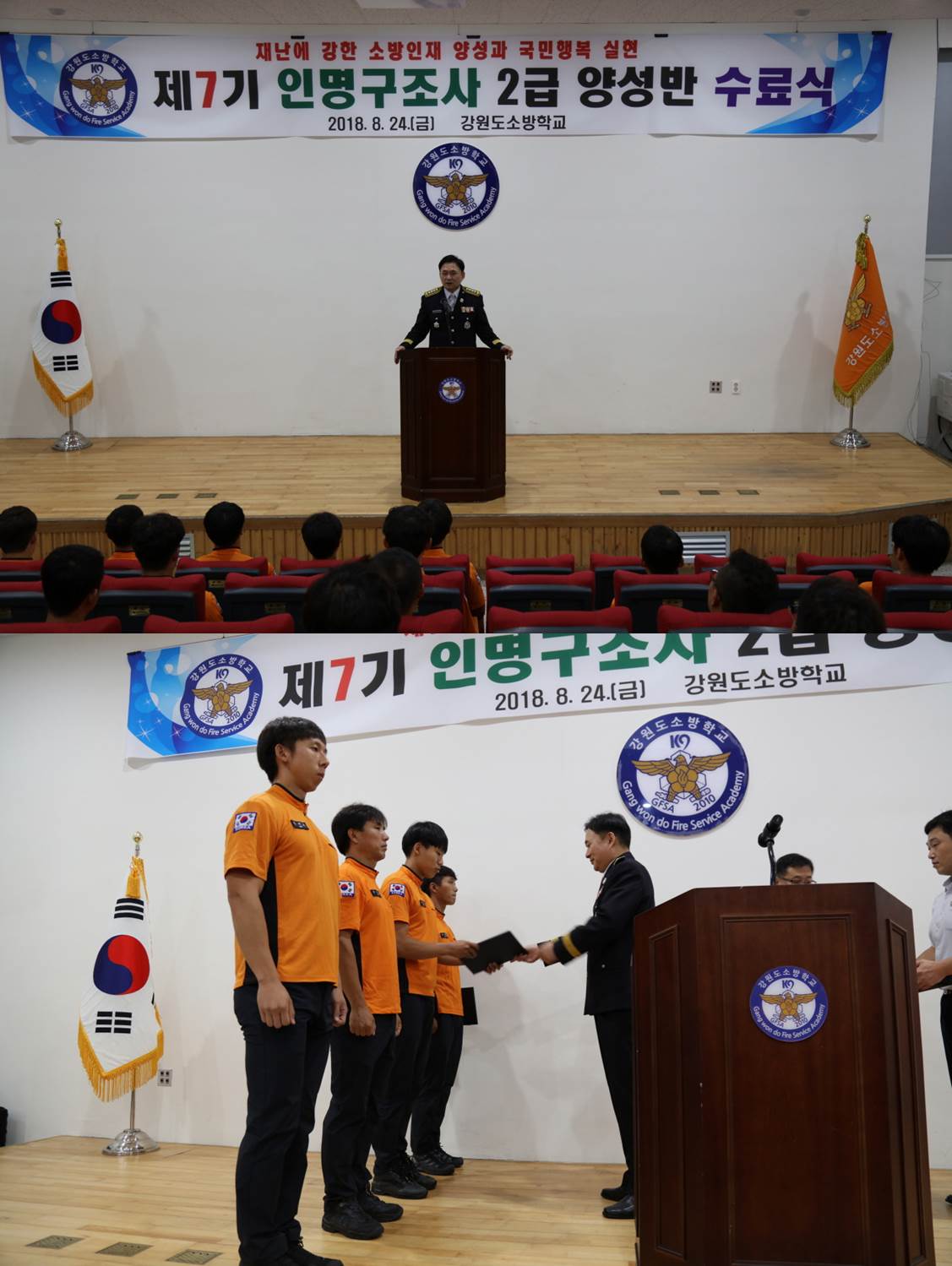 지방소방위 이하 희망자를 대상으로 실시한 제7기 인명구조사2급양성반 수료식이 8월24일 강원도 소방학교 제3강의실에서 거행되었습니다.