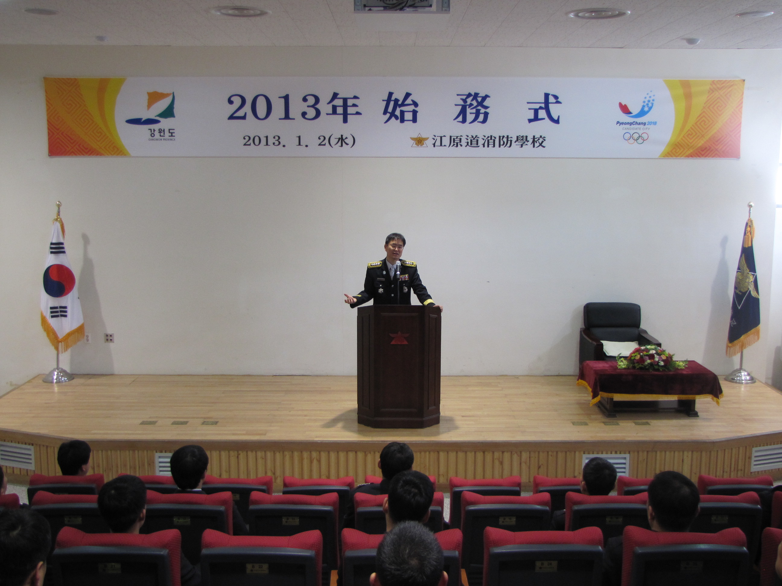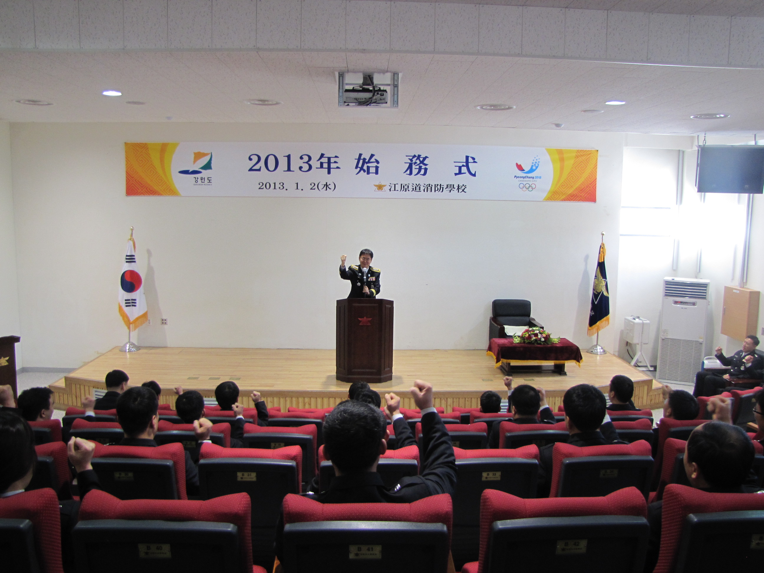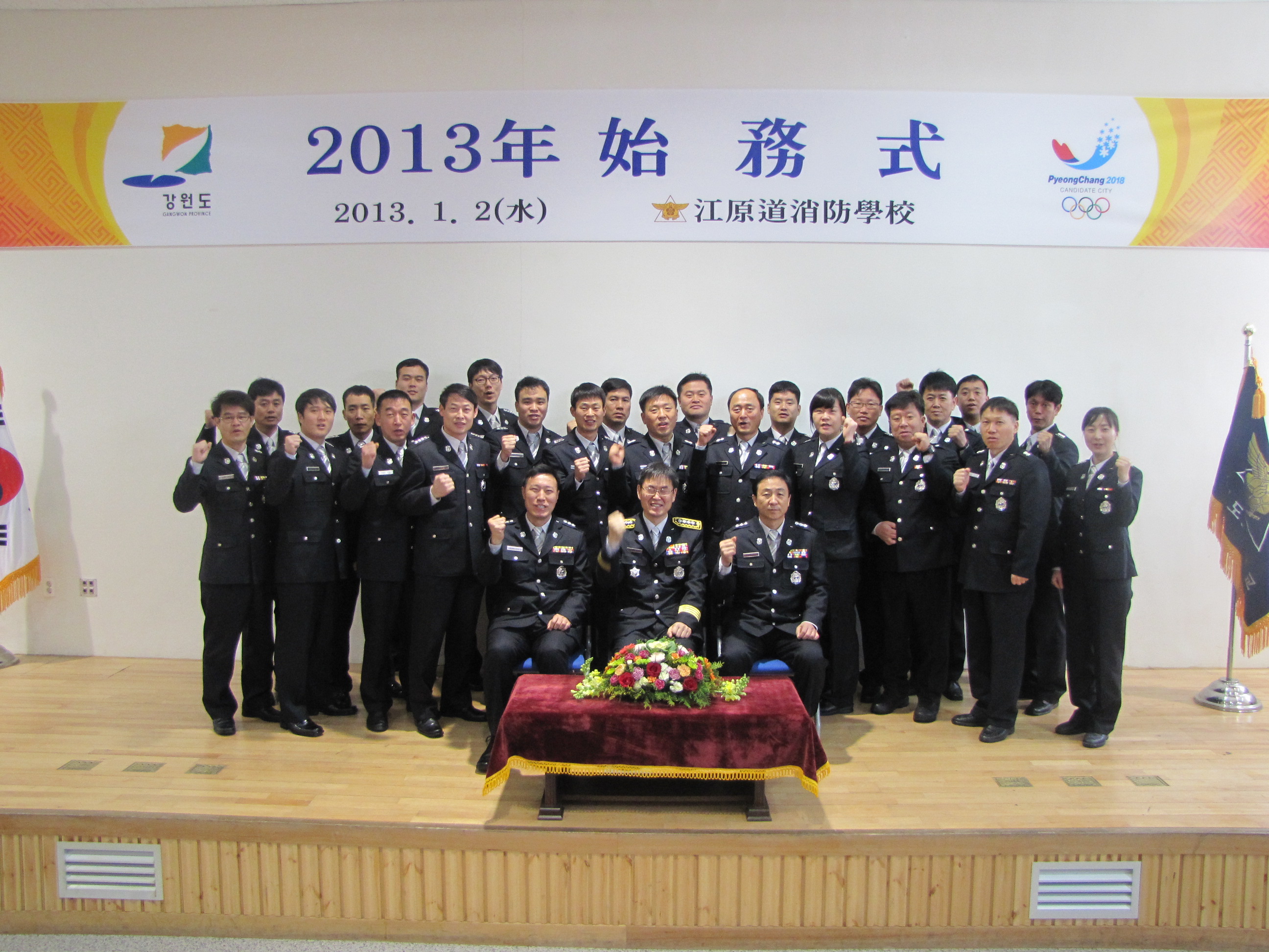 강원도소방학교(학교장 정병도)는 1월 2일 오전 10시 소방학교 대강의실에서 전 직원이 참석한 가운데 2013년도 시무식을 치루며 계사년 새출발, 힘찬 도약을 위한 "화이팅"을 외치고 있다.