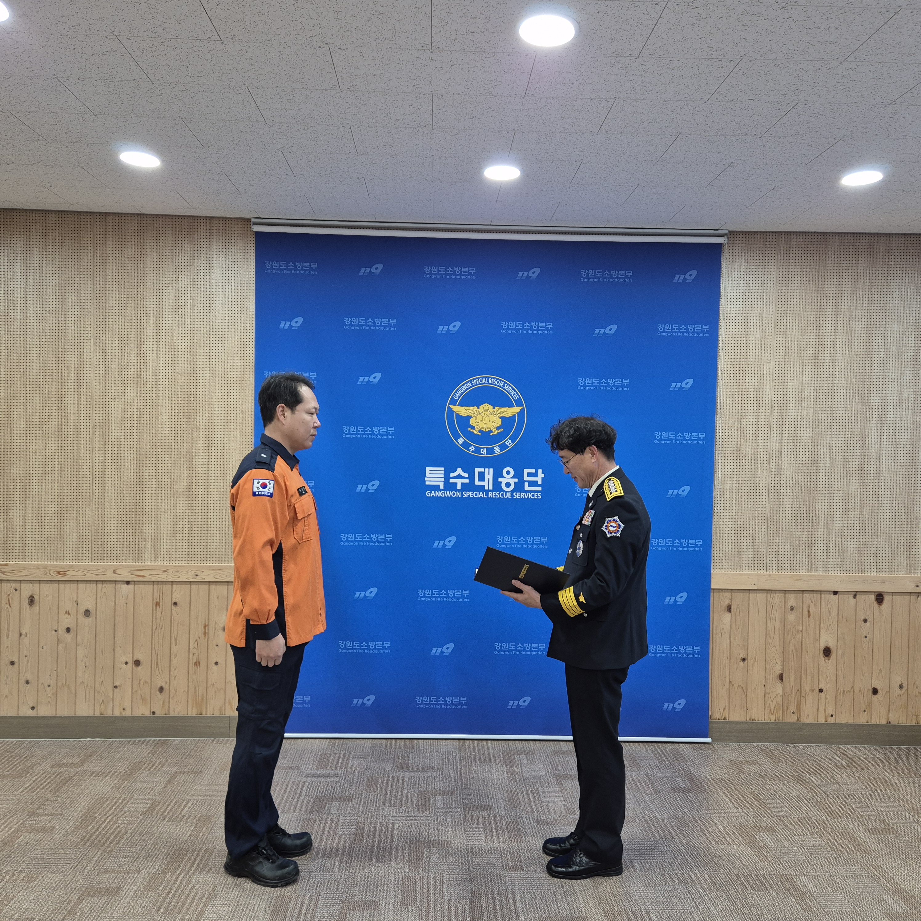 표창 대상자는 긴급기동대 소방위 박민재로 특수대응단에서 관리·운용하는 소방장비 관리 및 발전에 기여하였기에, 표창장을 수여하였습니다.