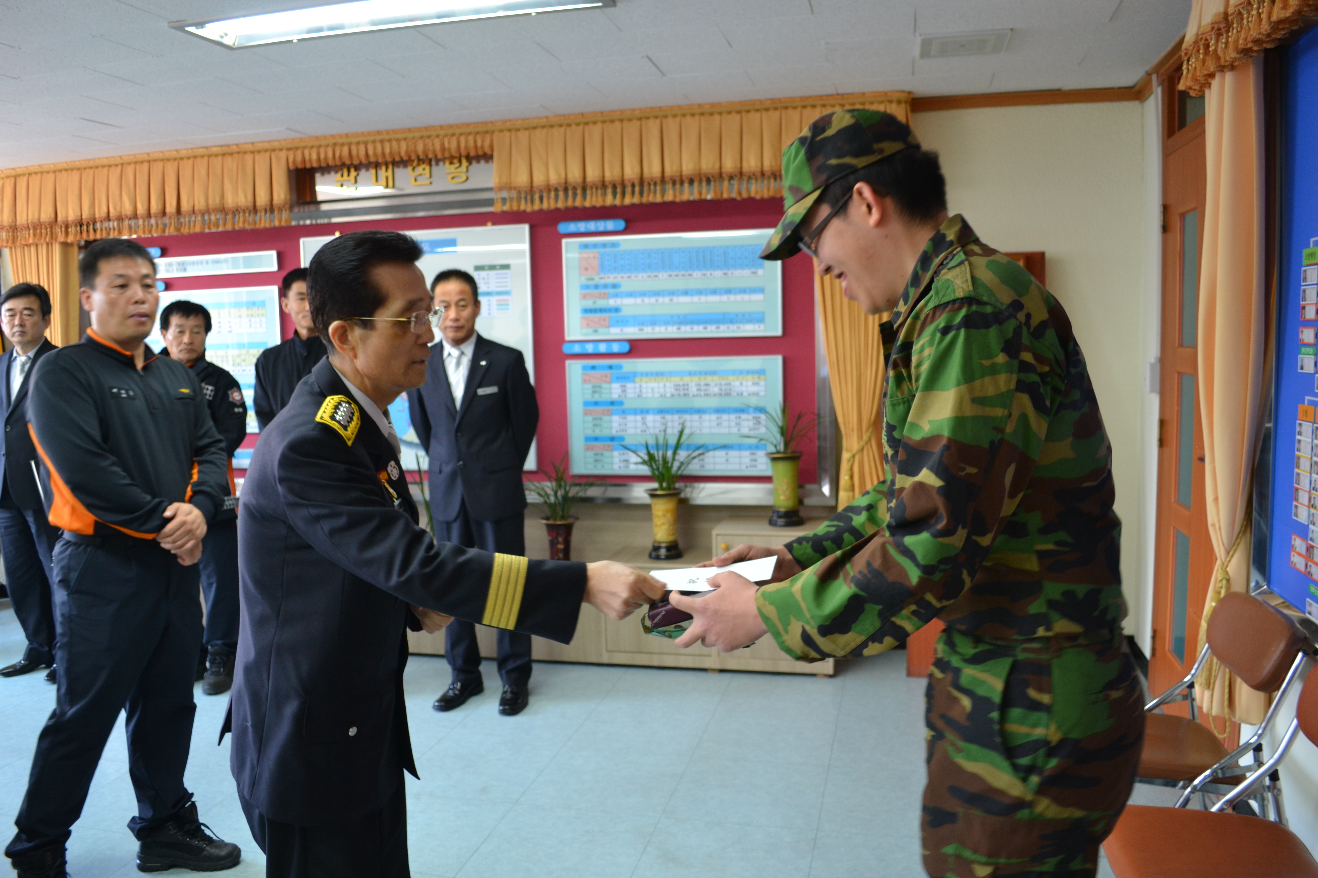 여윤길 태백소방서장은 그동안 긴박한 화재,구조,구급 현장에서 숙달된 보조로 시민의 안전을 위해 최선의 노력을 아끼지 않은 수방 최승환 의무소방원에게 공로패 및 전별금을 전달하고 무사히 전역하는 것을 다함께 축하해 주었다.