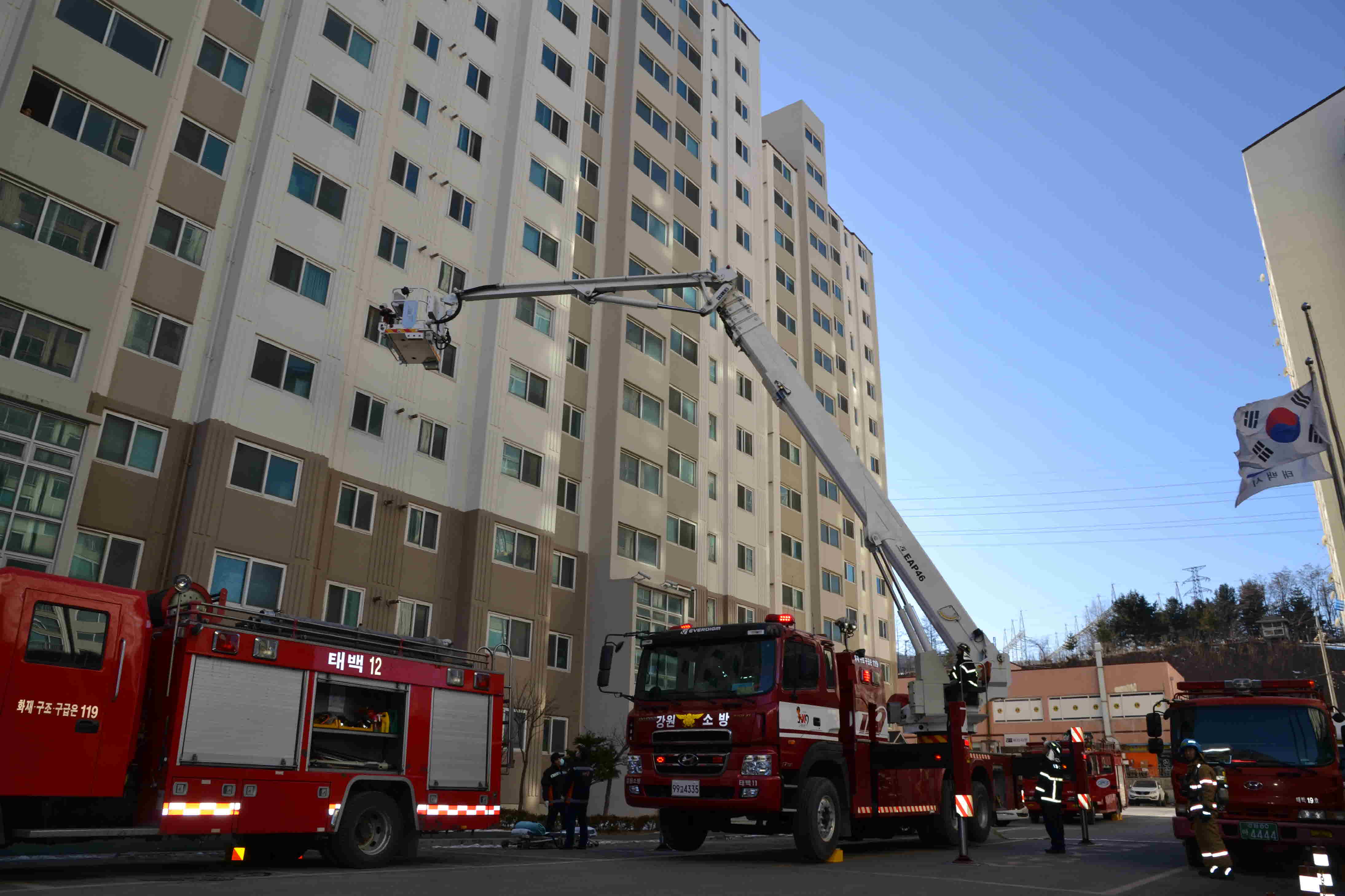 태백소방서(서장 이동학)는 9일 오후 2시 황지동 소재 유진2차아파트에서 소방공무원과 자위소방대 30여명이 참여한 가운데 “고층건물 현장대응능력 강화를 위한 합동소방 훈련”을 실시했다.