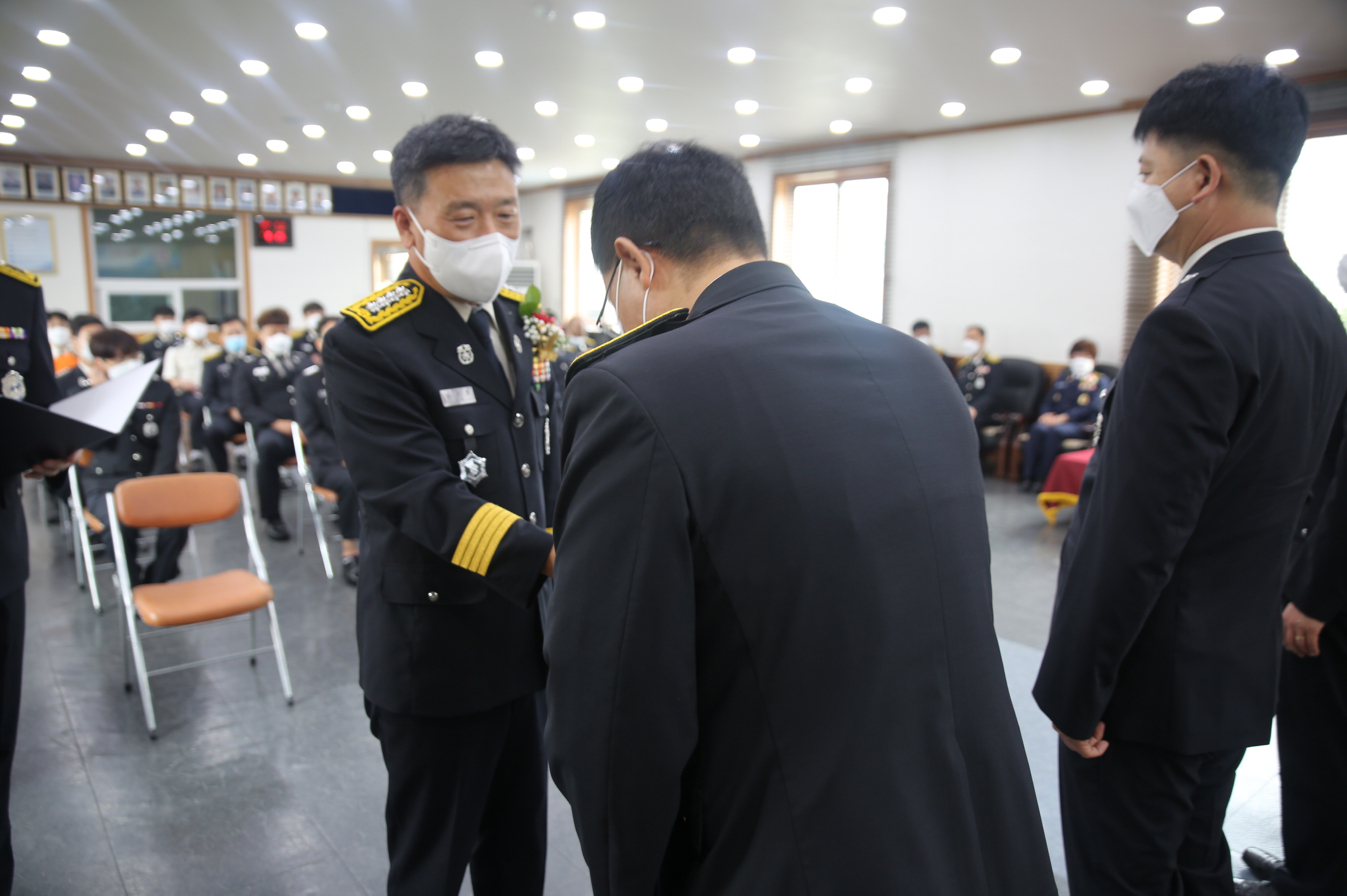 ○ 이번 임용장 수여식은 인사발령자 55명(전입자 36, 서내 전보자 10, 지원근무 1, 기구개편 8)에 대해 임용장을 수여했으며. 모범공무원으로 선정된 황재식 소방경에 대한 국무총리 표창장 수여식도 진행했다.