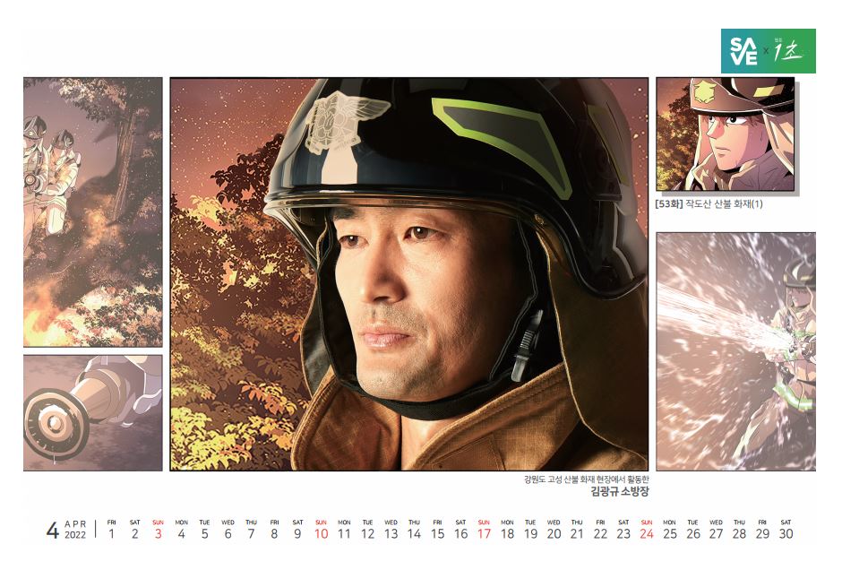 ◯ '2022년 캘린더'는 대표 리워드 제품으로 전국의 현직 소방관 콘테스트를 통해 선발된 7팀의 소방관들이 '네이버 웹툰 1초(작가 시니), 광운 주인공들과 오마주하는 콘셉트의 화보를 담고 있다.
