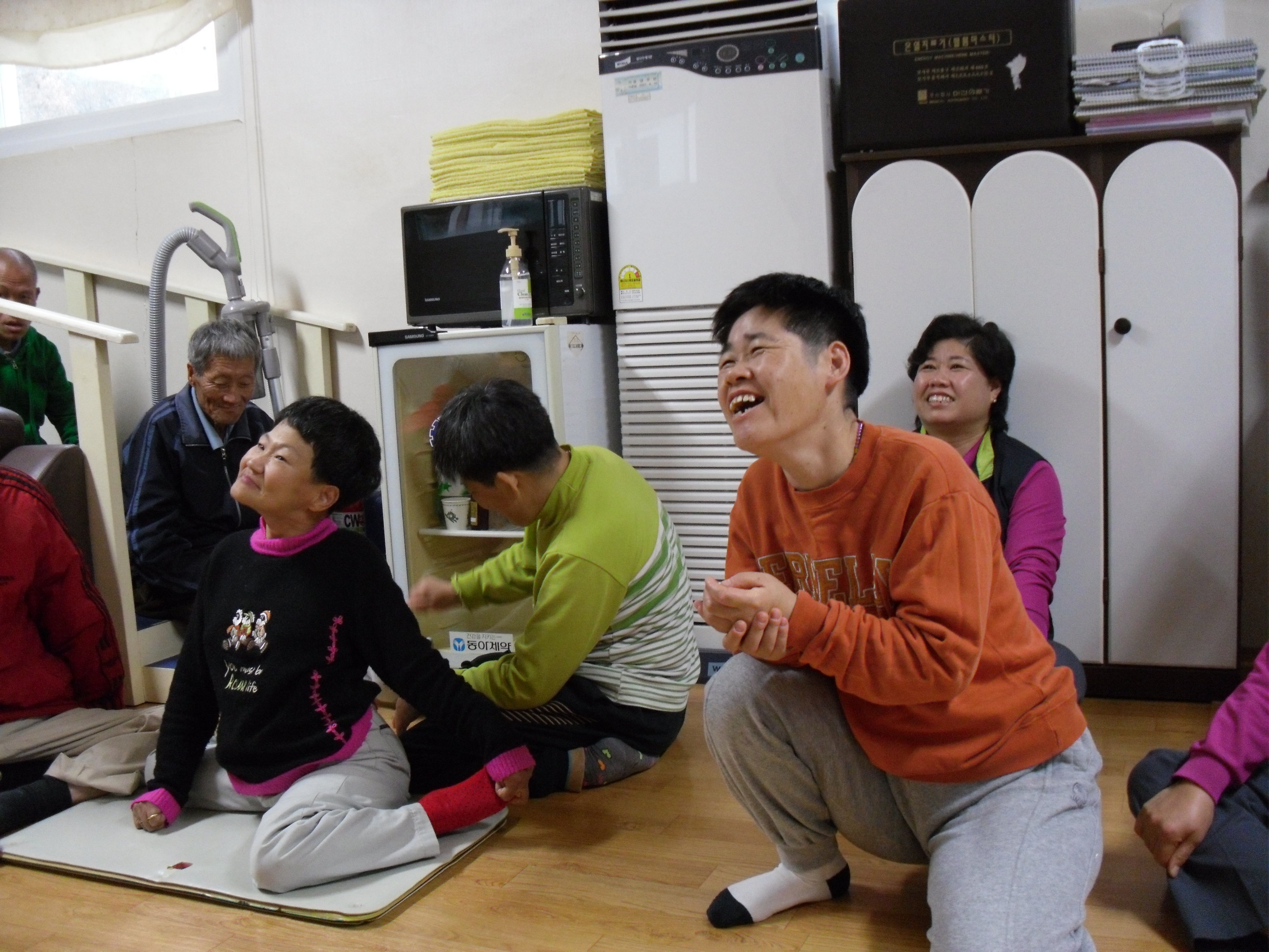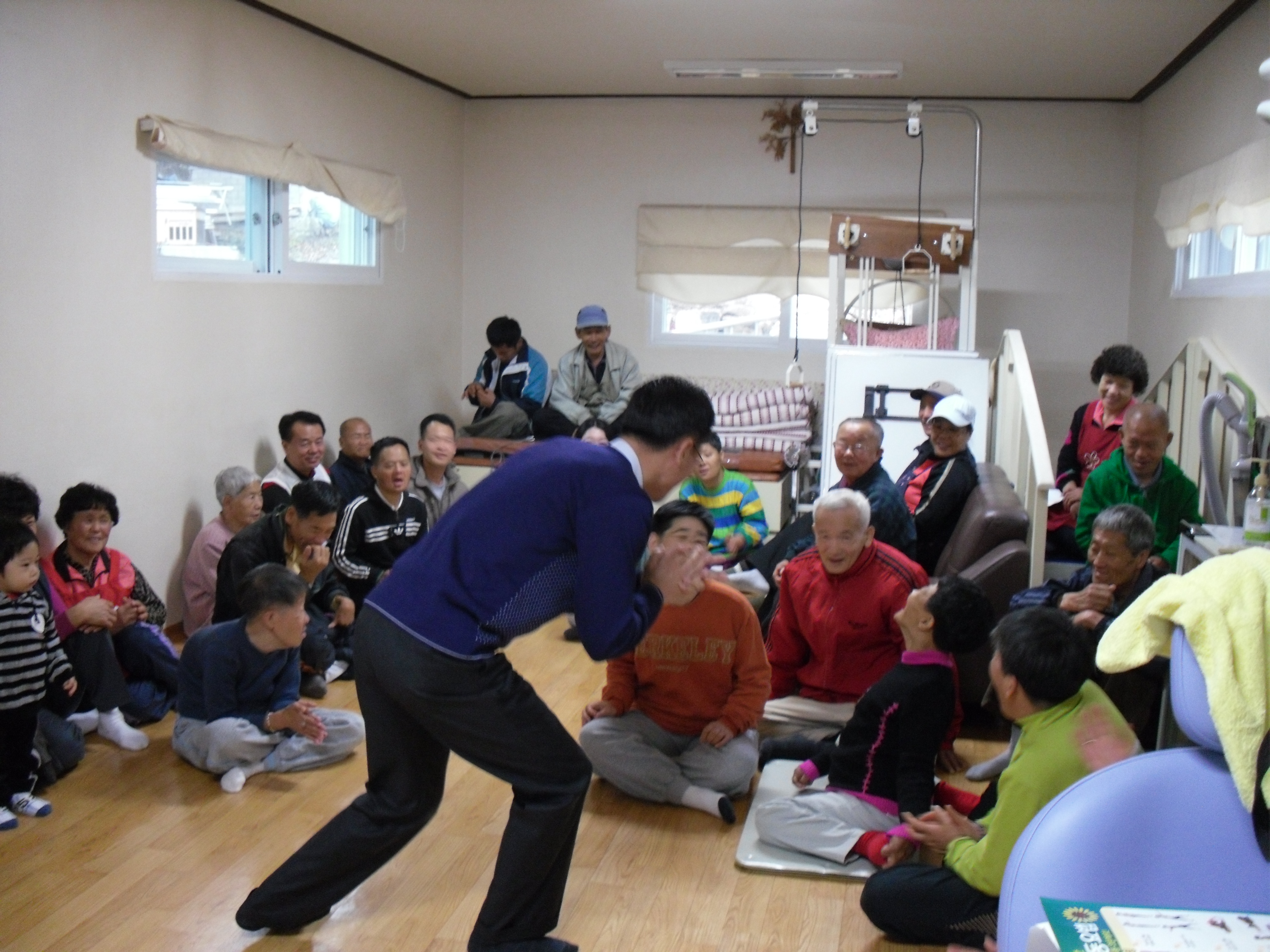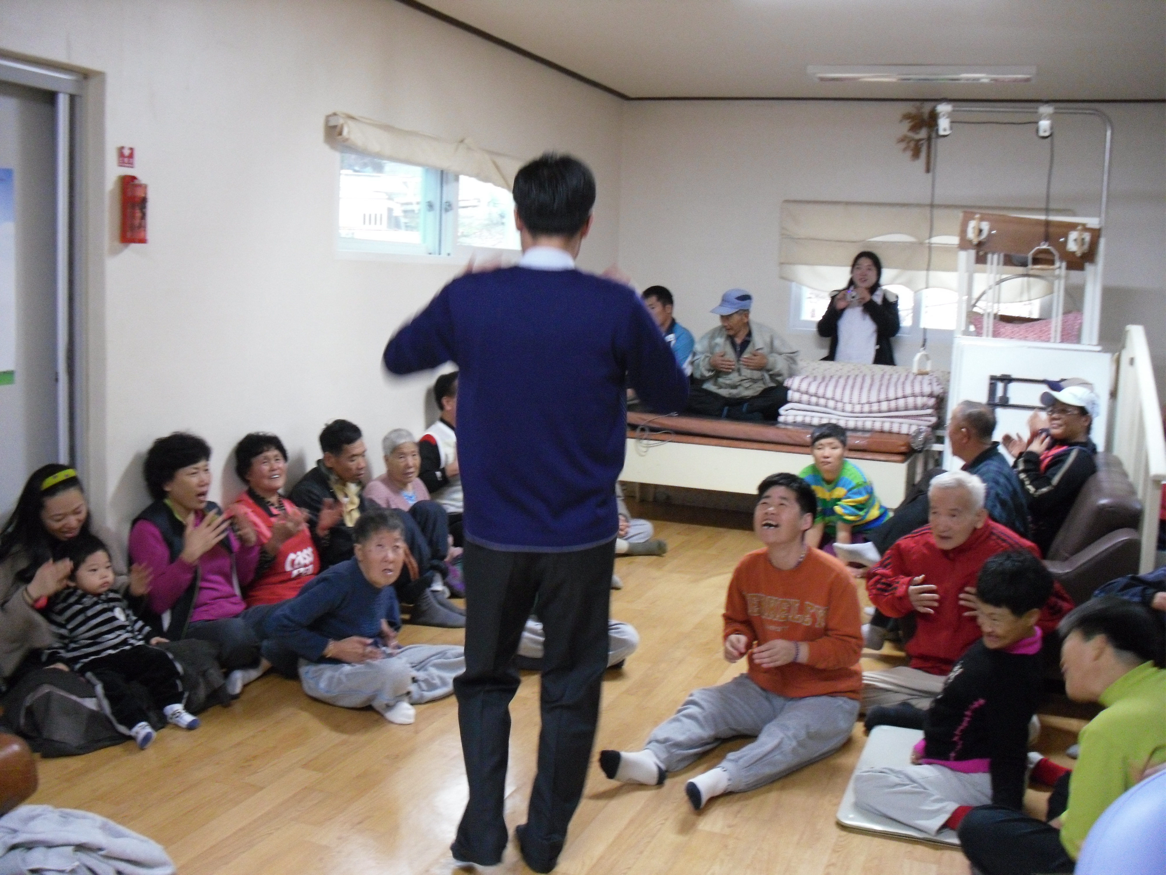 웃음치료를 시작하기 전 베닉노의 집 관계자분은 가족들의 상태를 고려해서 반응이 없어도 너무 서운해하지 마시라며 걱정을 많이하셨습니다. 하지만 걱정은 기후일 뿐이었고, 처음에 시큰둥하던 가족들이 시간이 흐를수록 열렬하게(?!!!!) 호응해 주었습니다. 박흥규님이 아코디언을 연주 할 때는 누가 시키지 않았는데도 모두 함께 박수를 쳤고, 앞으로 나와 박자를 맞추며 춤을추는 가족들도 있었습니다. 가족들의 활짝 웃는 얼굴을 바라보며 저의 마음에는 행복이 한가득 번져갔습니다. 아마 다른 대원들도 같은 마음이었을 것이라 생각됩니다.