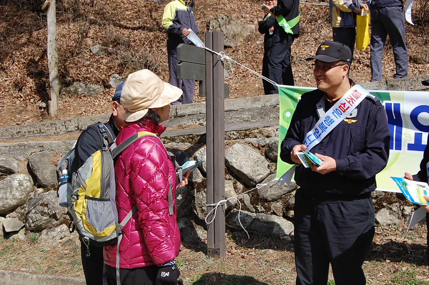 캠페인 지정 장소에 산불예방 플래카드를 설치한 후 홍보활동을 나선 소방인들은 우리 지역의 아름다운 자연을 방문해 주신 등산객에게 어깨띠를 착용한 후 산불예방 홍보 전단지를 배부, 취약요소 정비 및 제거 등 산불예방을 위한 시민 계도를 실시하였습니다.