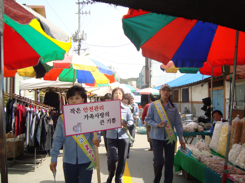 참여자 전원은 둔내면 민속5일장터에 대하여 가두행진 및 주민들을 대상으로 전단지 배부 및 홍보를 실시하였으며, 둔내의용소방대원은 상가내 비치한 소화기등을 점검하기도 하였습니다.
