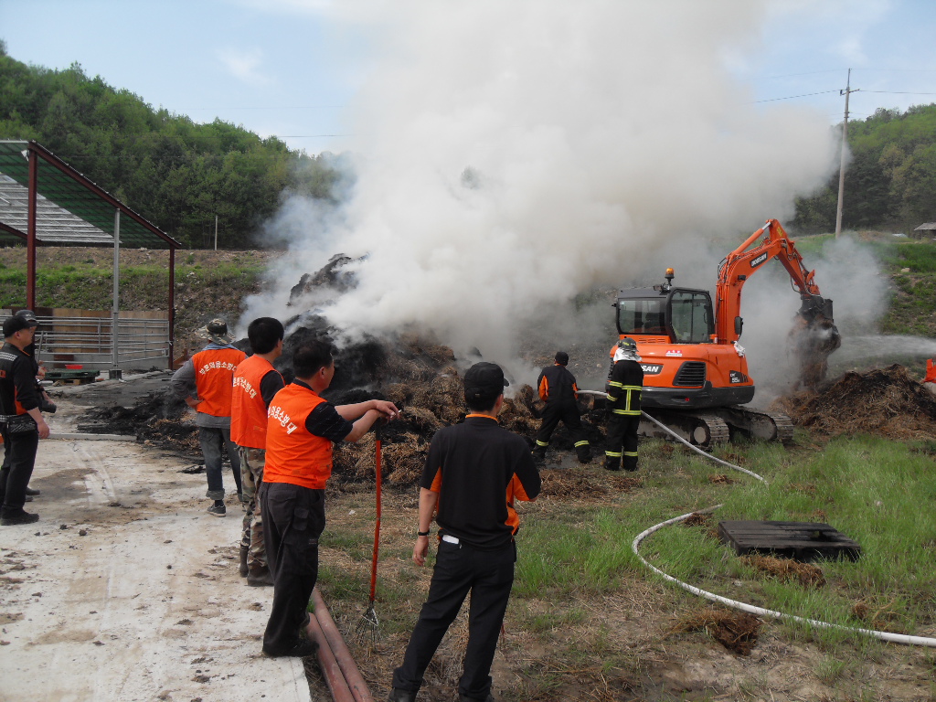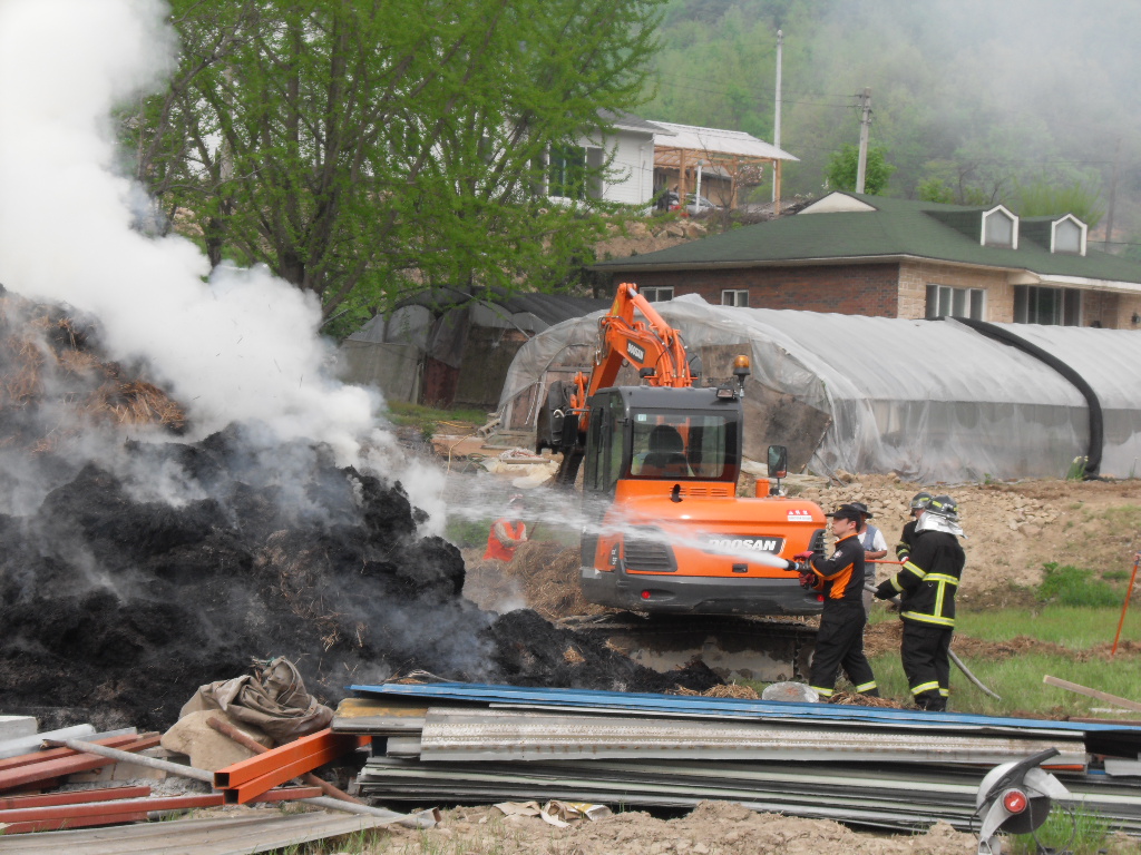 부론의용소방대(대장 김진수)는 5월9일 15시10분경 발생한 정산리 샘골 마을 축사 볏짚 화재에 15명의 대원이 출동 화재진압및 진입로 확보등 화재진압 활동을 진행하였습니다. 이날 화재는 건조한 날씨속에 축사보수 공사중에 용접불똥이 볏짚으로 옮겨붙어 일어난것으로 추정되며 인명피해는 없었으나 볏짚에 붙은 불이 특성상 소화하기가 힘들어 포크레인등 장비를 투입해서 일일이 볏짚을 헤집고 옮기면서 진화하는등 장시간 진화작업이 이뤄졌습니다. 농가에서는 사소한 작업에도 불씨가 옮겨붙을수 있는점등을 주의하여야 하겠습니다. 저녁 늦은 시간까지 작업에 참여해 주신 대원분들에게 다시 한번 감사드립니다.