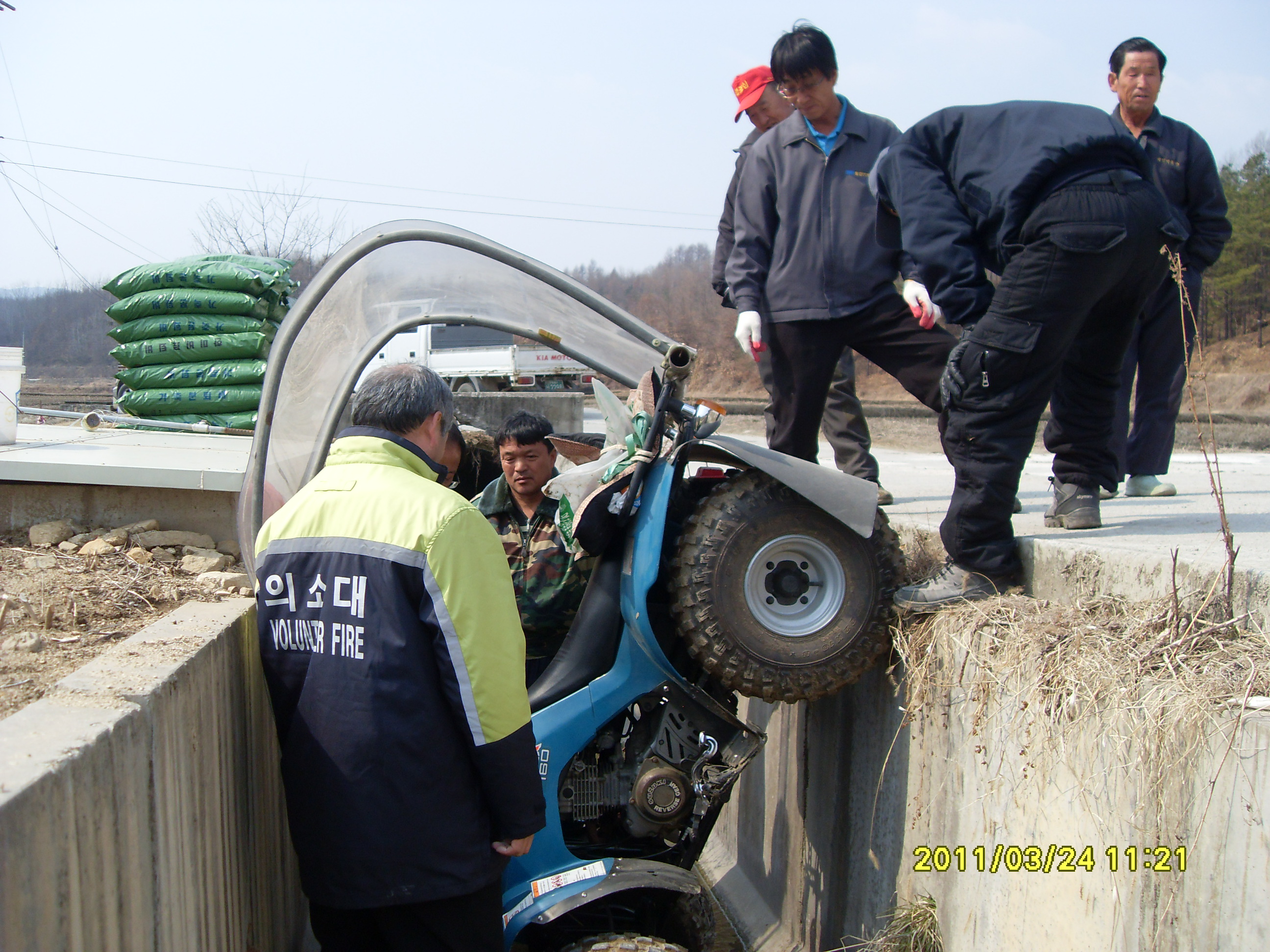 화제 진압 출동후 귀소하는 길에 오토바이가 전복된것을 호저 의소 대원이 꺼내주고 있다