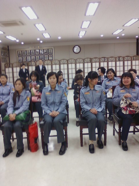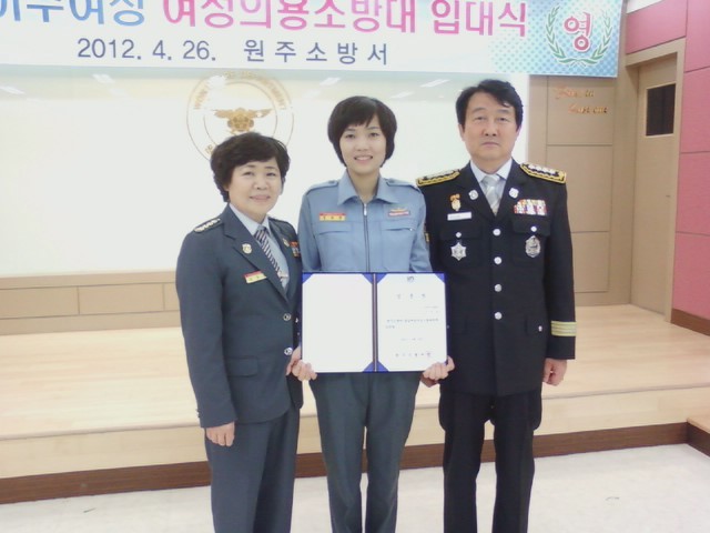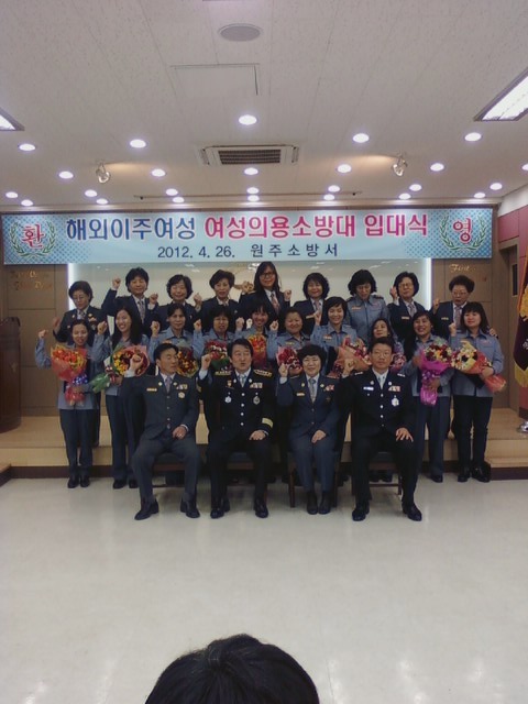 흥업여성대(대장오오석)에서는 2012년 4월26일 오전10:00에 "해외이주여성 여성의용소방대 입대식"에 다녀왔습니다.10개대 단체에서 12명이 입대하였습니다.새로운 모습에 약간 낯설어 하는 것 같았지만, 기동복입은 모습이 맘에 들었나봐요.휴대폰사진에 담고, 서장님과 사진도 찍고, 내내 즐거운 모습이였습니다.여성의용소방대 대원으로써 열심히 활동하겠다는 말과 함께 굳은 의지와 자부심이 느껴졌습니다.
