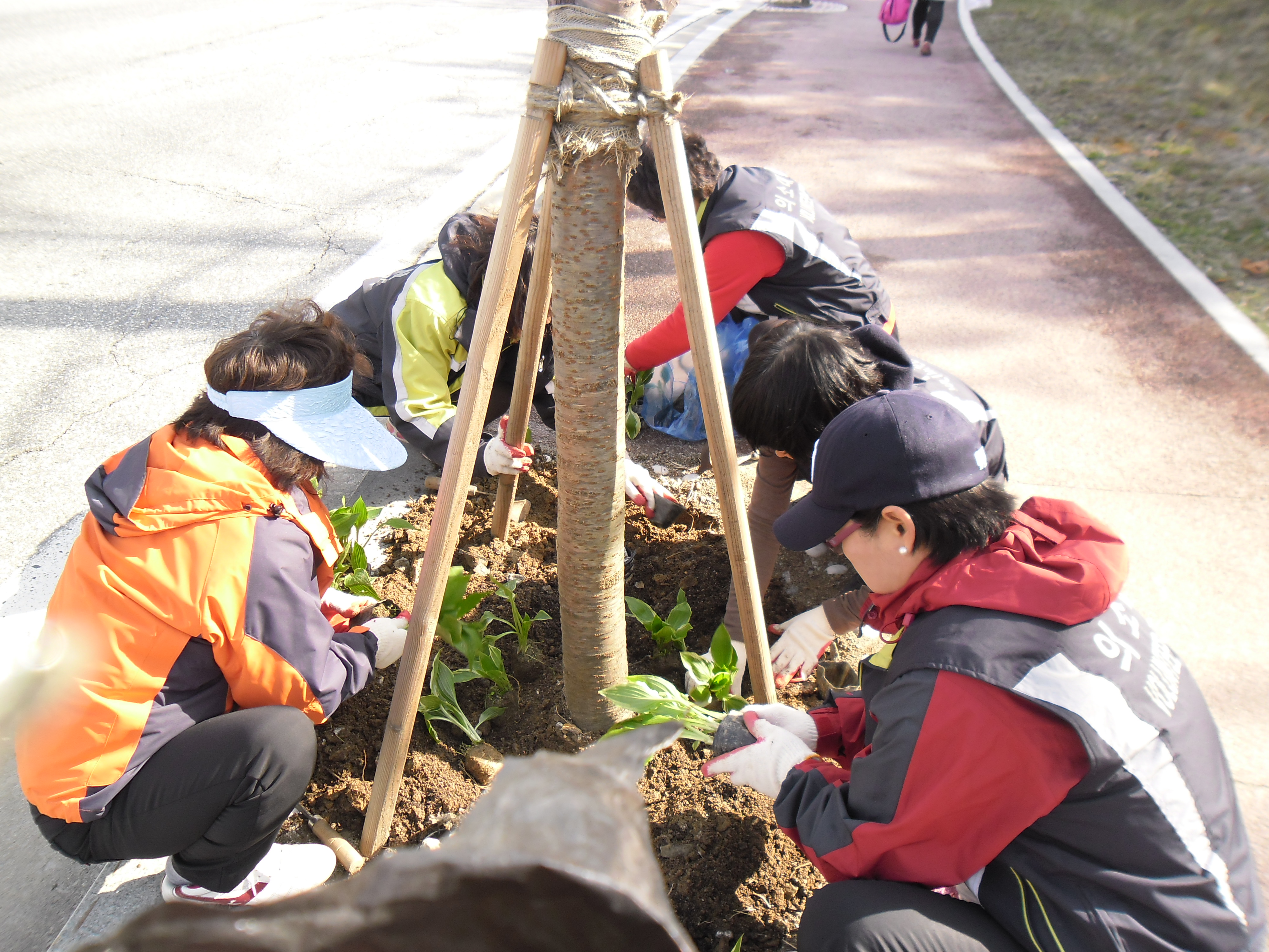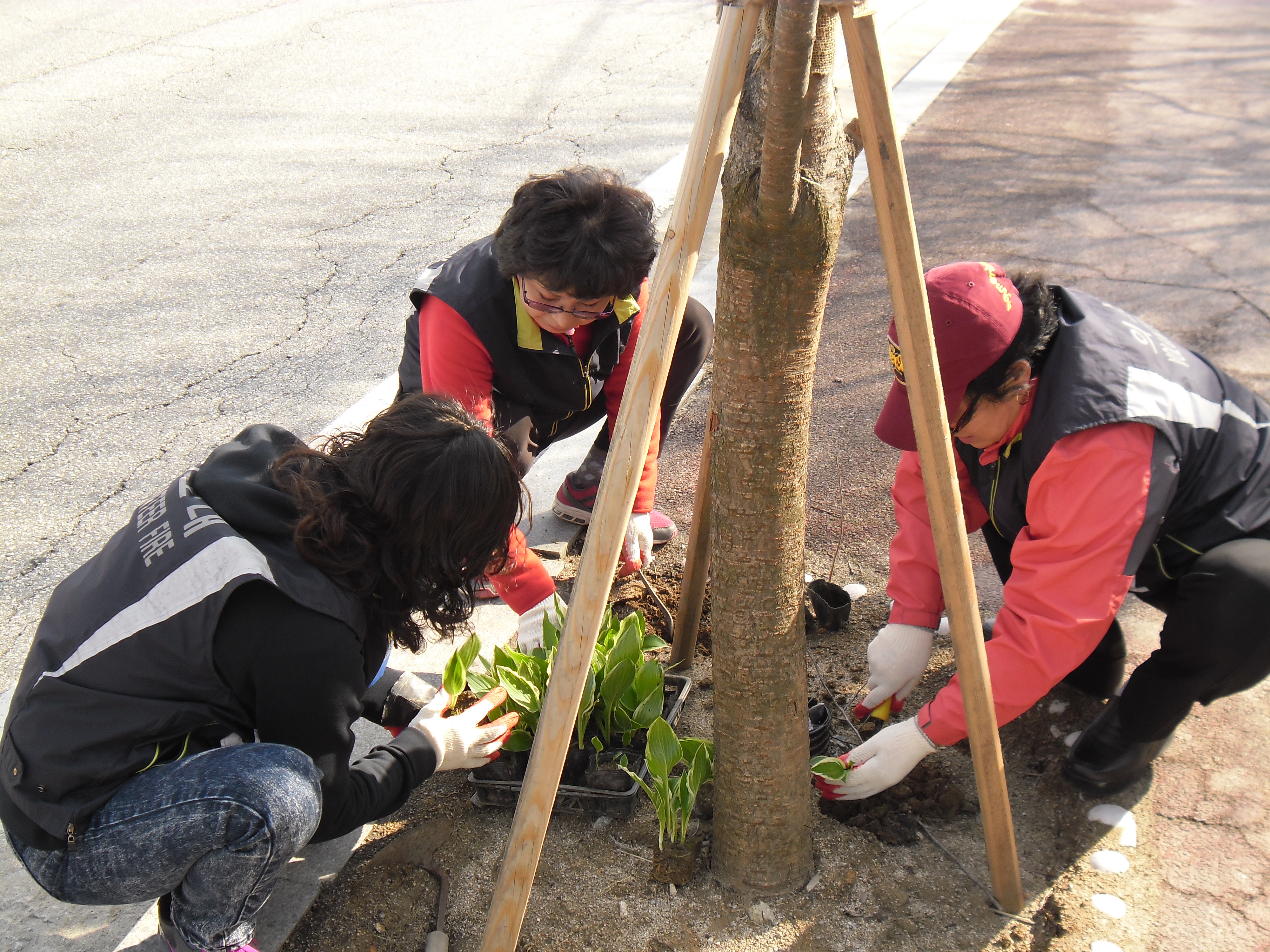 흥업 여성대원들은 거리환경 정화 를 하기위하여 벗나무 화단 비비츄 심기를 실시하였습니다 ~~