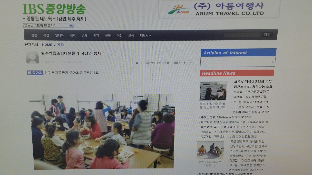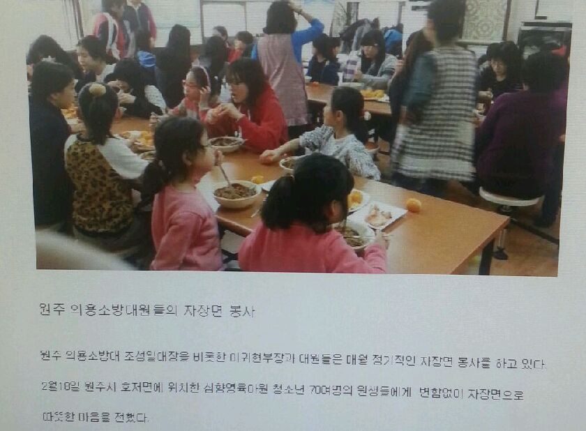 원주의용소방대 IBS중앙방송에 오늘 심향영육아원 자장면중식봉사 기사가 실렸습니다