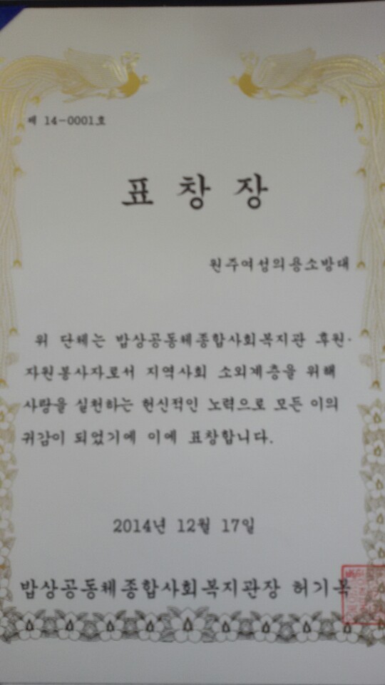 원주여성의용소방대가 우수봉사단체상을 수상하였습니다.