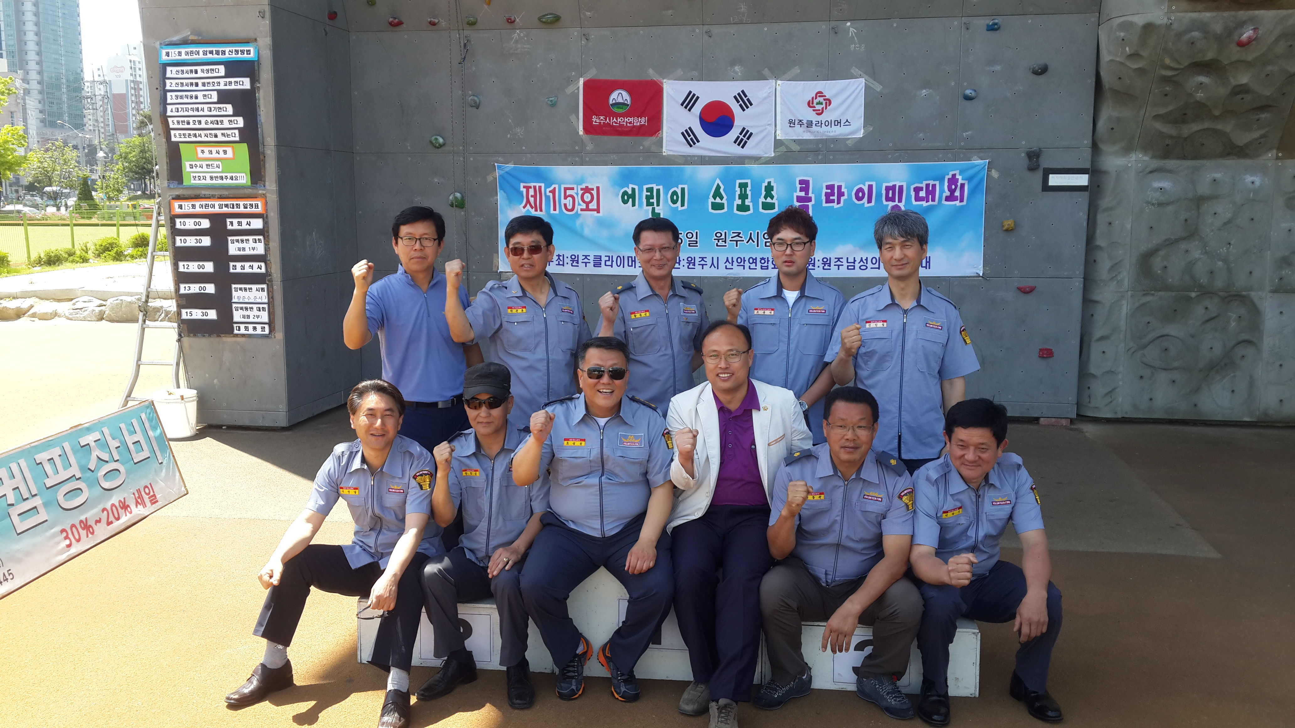 원주남성의용소방대(대장 조성일)는 5월5일 원주시 따뚜공연장에서 2015년 어린이날 행사로 소방체험과 제15회 어린이스포츠클라이밍체험대회를 원주시암벽장에서 원주클라이머스 회원들과 우리대원 20명이 참가하여 어린이 300명에게 체험 암벽등반을 할수있게 도와 주었읍니다. 원주소방서 서장님,원주시남,여 연합대 대장님이 참가하여 격려 해 주셨습니다