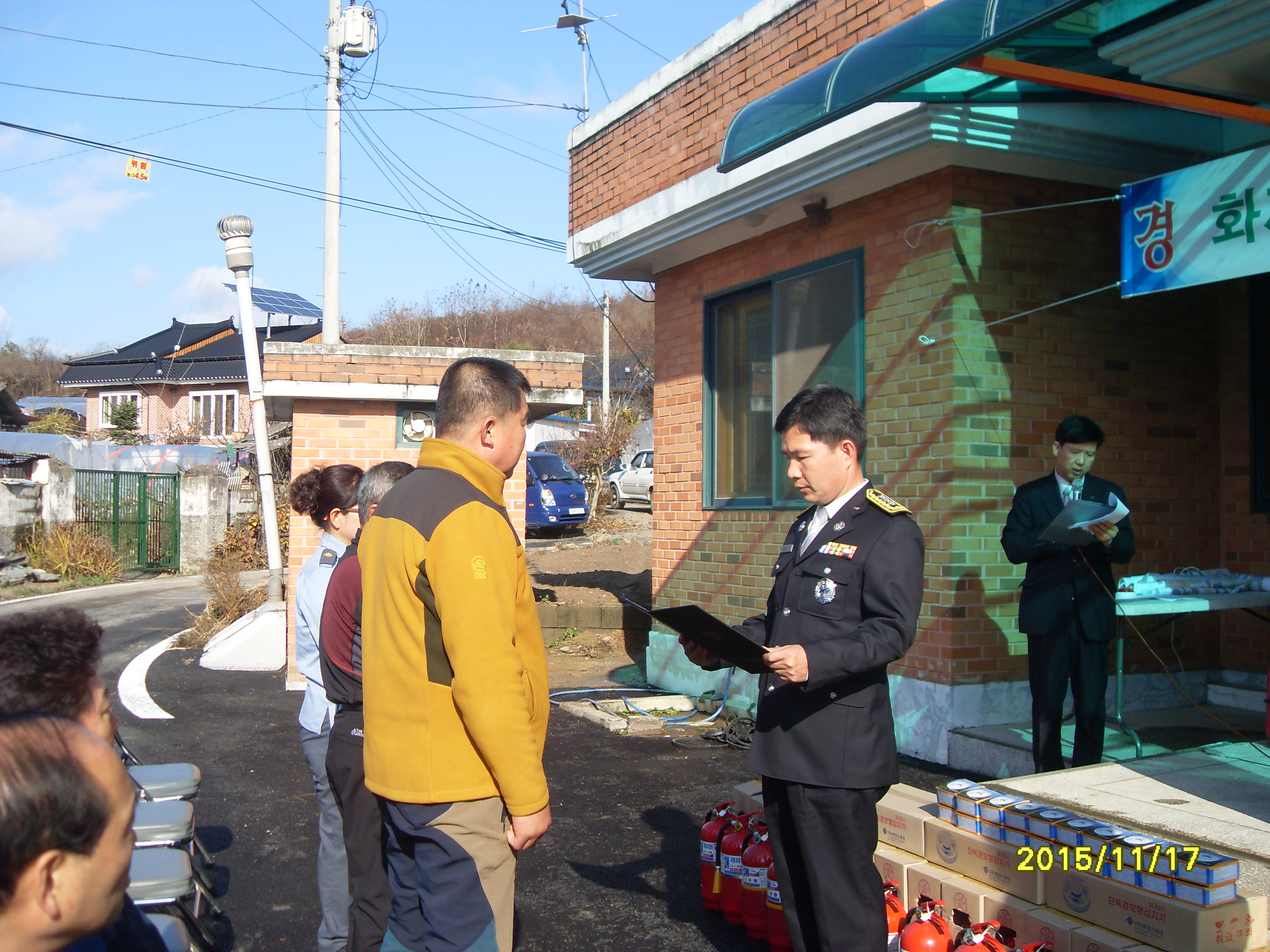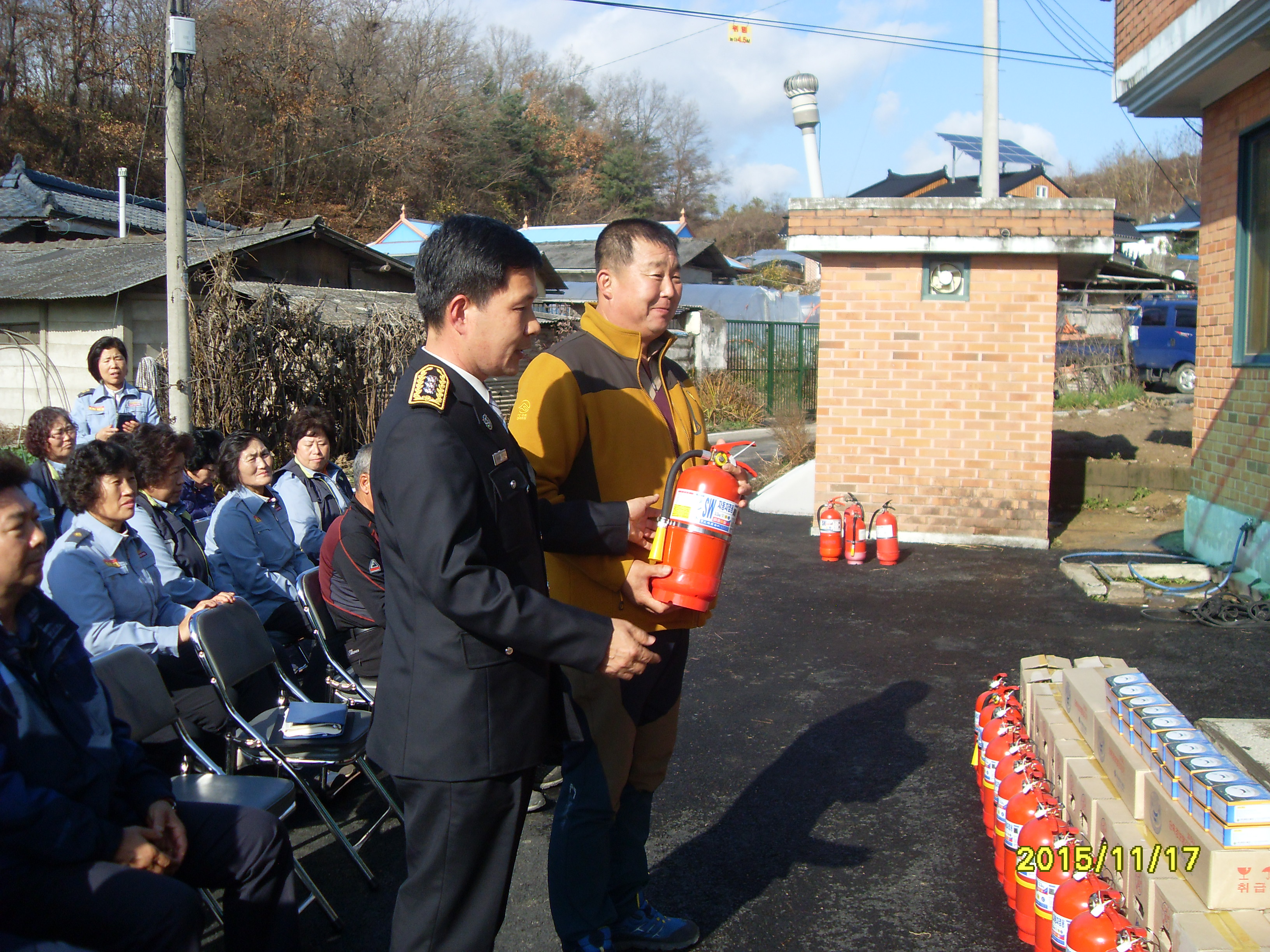 각 가정에 소화기 1개 화재경보기 2개를 호저의용소방대 대원이 각 가정을 방문하여