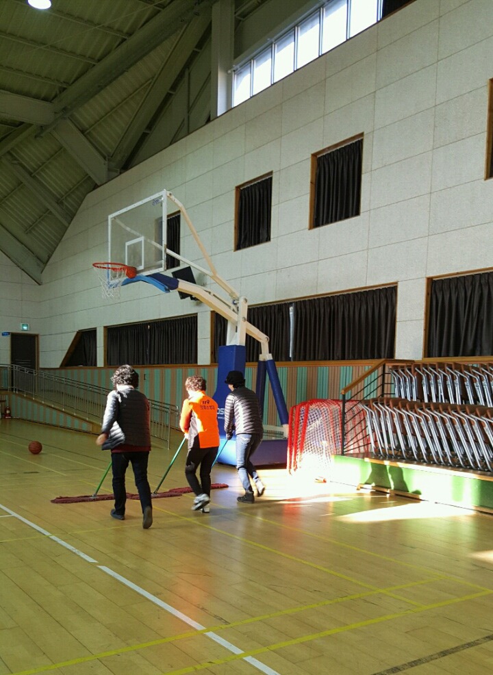 내용: 체육관 실내 바닥청소 및 입구먼지제거 쓰레기분리수거