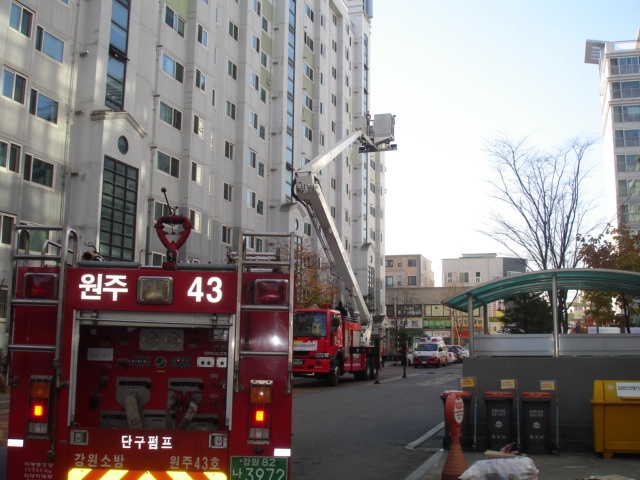 원주소방서 단구119안전센터(센터장 박세영)에서는 2010.11.10(14:00~) 관설동 소재 현진4차아파트에서 고층건물 현지적응 출동 소방훈련이 있었습니다. 이날 훈련중점은 화재시 신속한 외부대피 방송, 고가차 부서선정, 연결송수관 연결훈련이었으며 관계자를 대상으로한 소방안전교육도 동시에 실시하였습니다.