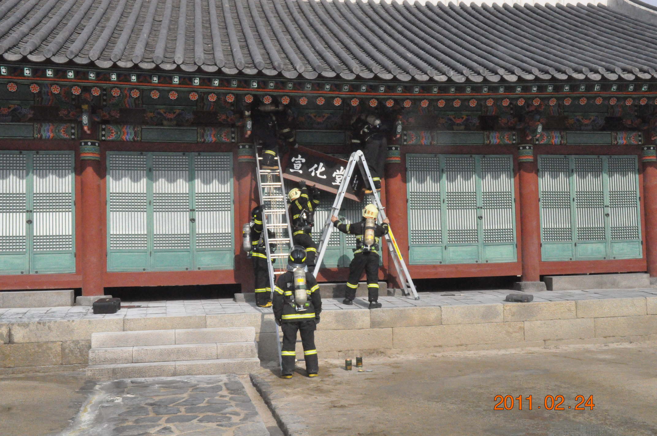 가상화재를 가정하여 현판 탈착 이동조치 및 사다리 이용 지붕 전개 등