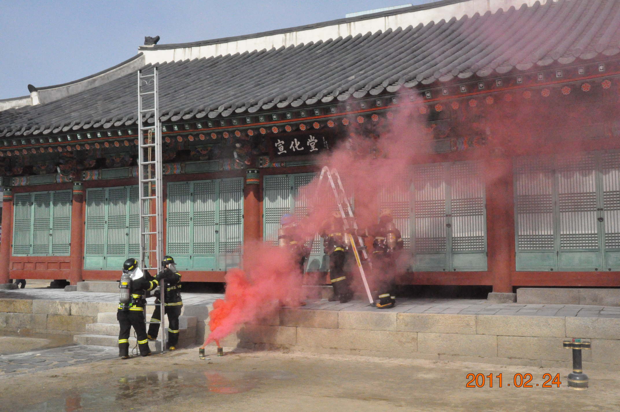 문화재 보호를 위한 실질적인 화재진압훈련을 하였습니다.