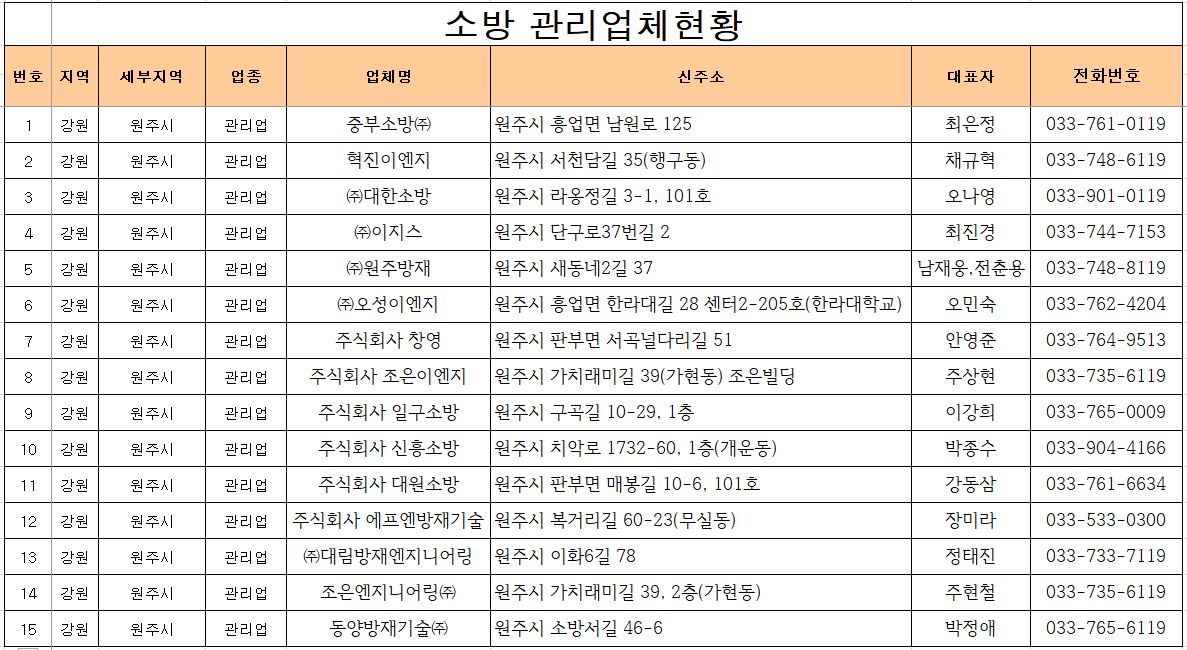 원주시 관내 소방리업체 현황을 공지합니다.(2024. 12. 18. 기준)