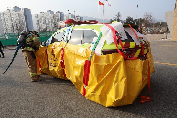 양구소방서(서장:용석진)는 지난 5일 소방서에서 이동식 냉각수조를 이용한 전기차 화재진압훈련을 실시했다.