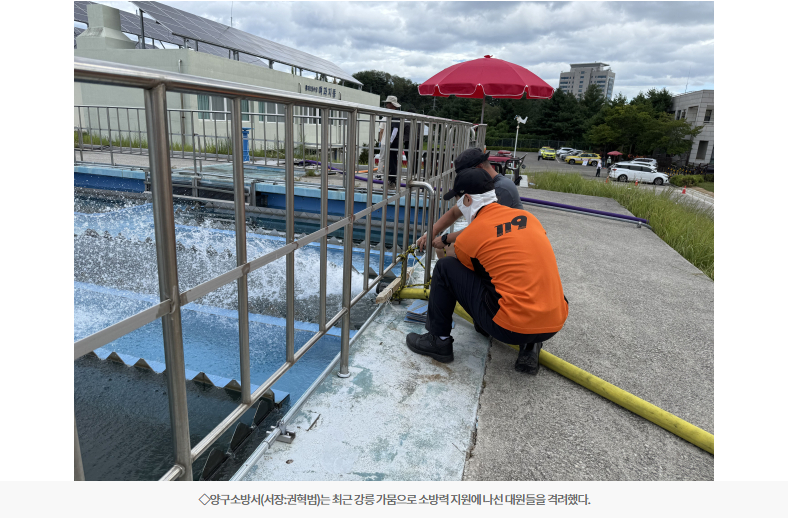 양구소방서는 지난달 30일 강릉시 가뭄에 따른 국가소방동원령이 발령됨에 따라, 지난 1일부터 홍제정수장에 하루 42톤 규모의 급수 지원을 이어가고 있다.