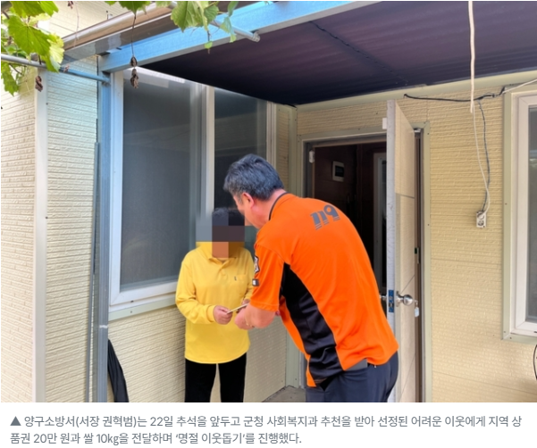 양구소방서(서장 권혁범)는 22일 추석을 앞두고 군청 사회복지과 추천을 받아 선정된 어려운 이웃에게 지역 상품권 20만 원과 쌀 10㎏을 전달하며 ‘명절 이웃돕기’를 진행했다.