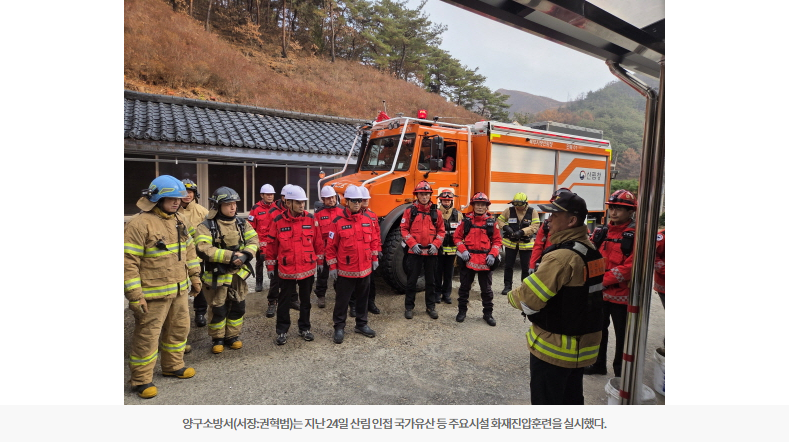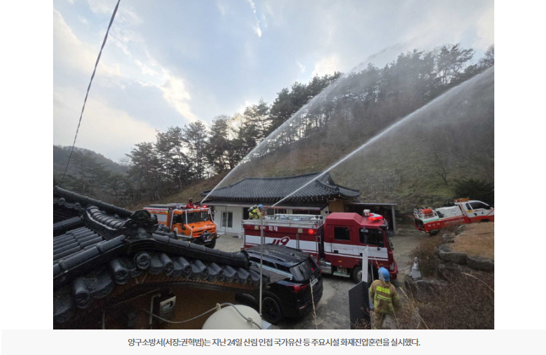 양구소방서(서장:권혁범)는 지난 24일 산림 인접 국가유산 등 주요시설 화재진압훈련을 실시했다.