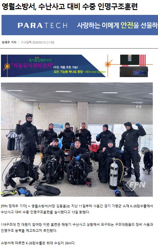 영월소방서는 지난 11부터 13일까지 경기도 가평 K-26잠수풀에서 수중 인명구조 훈련을 실시했다.
