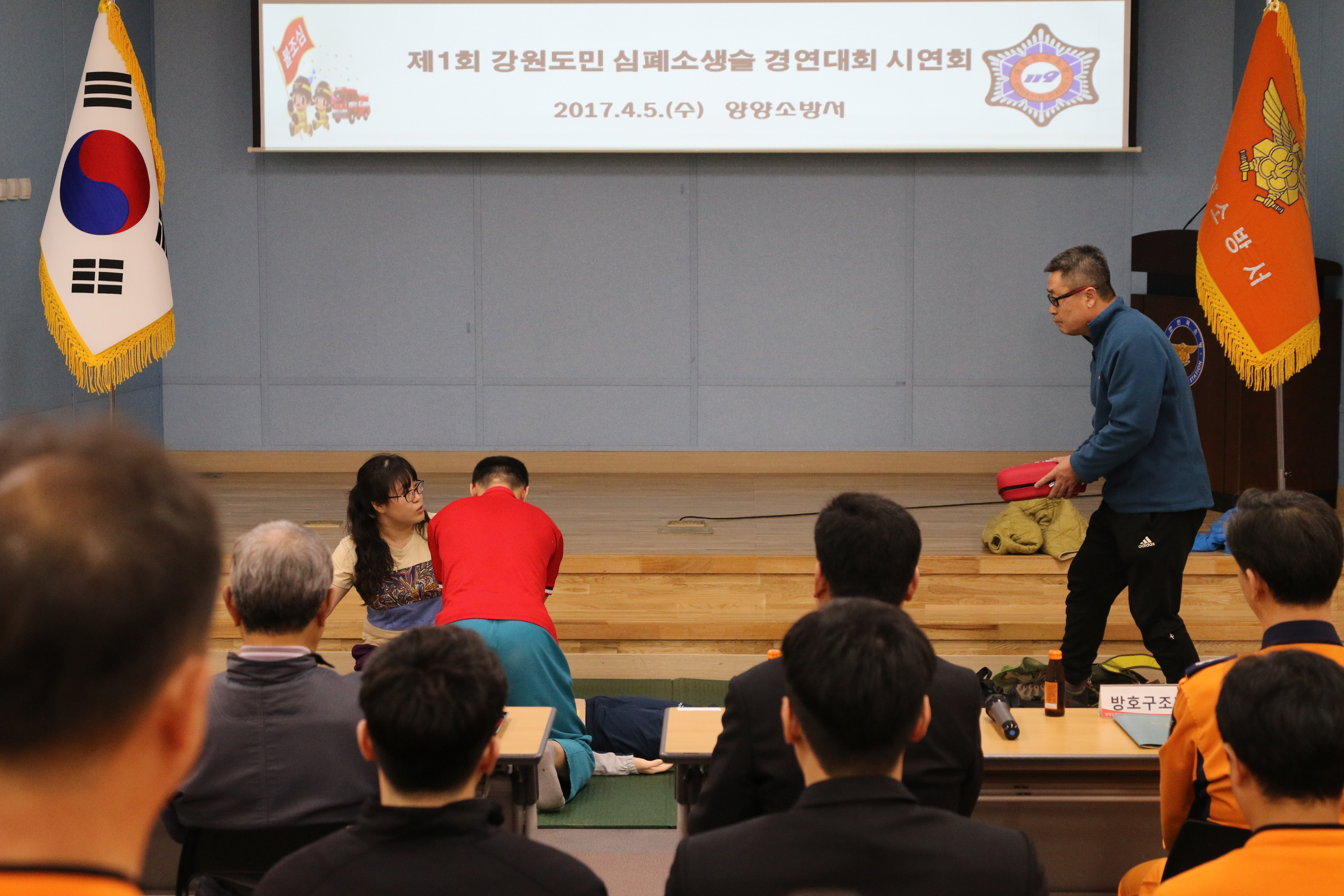 또한 양양소방서장과 정다운마을요양원장 외 직원들이 지켜보는 가운데 강원도민 심폐소생술 경연 대회 직전 실전과 같은 연습이 될 수 있도록 리허설이 진행되었다.